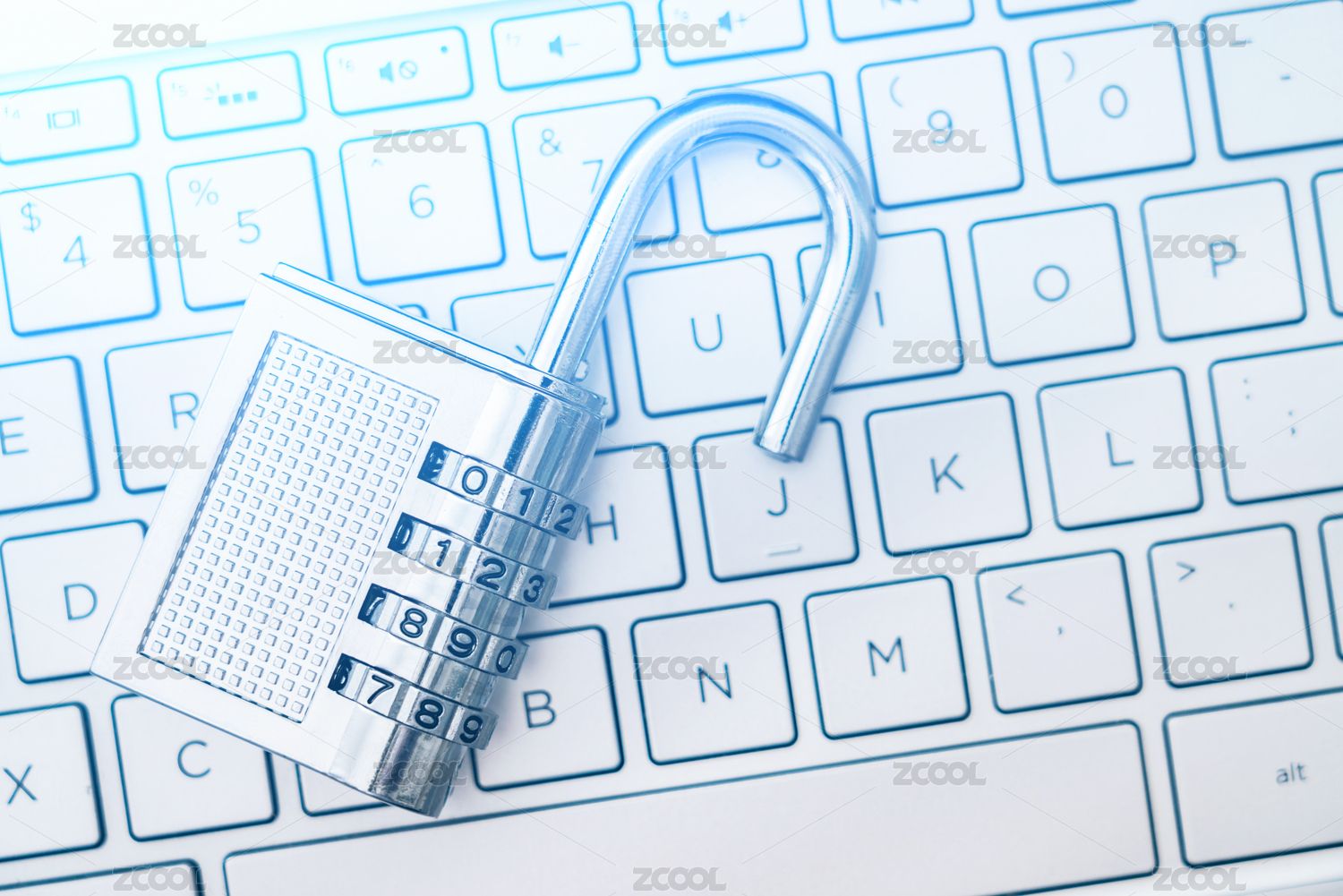 一把打开的锁子放在电脑键盘上