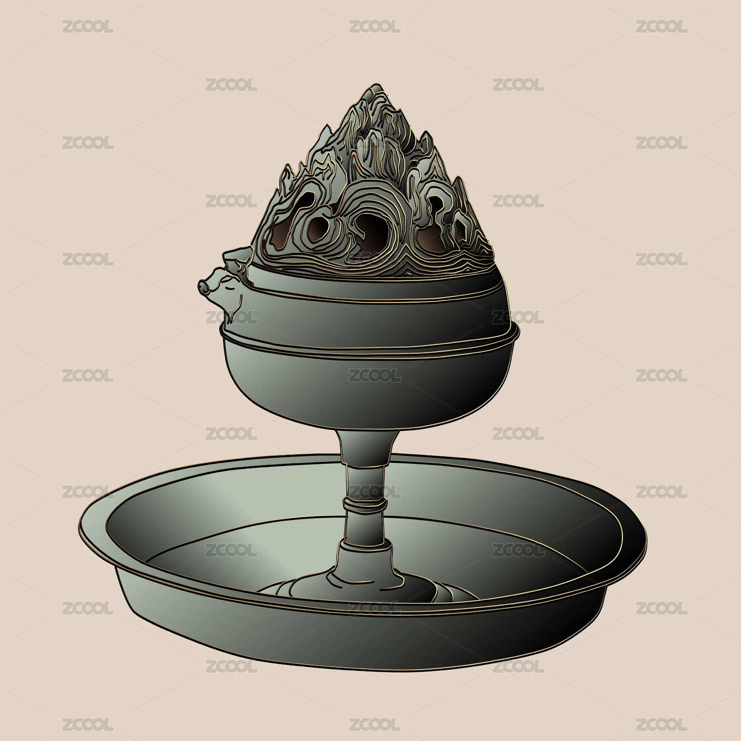 古风汉代带盘博山炉铜炉手绘矢量线稿插画