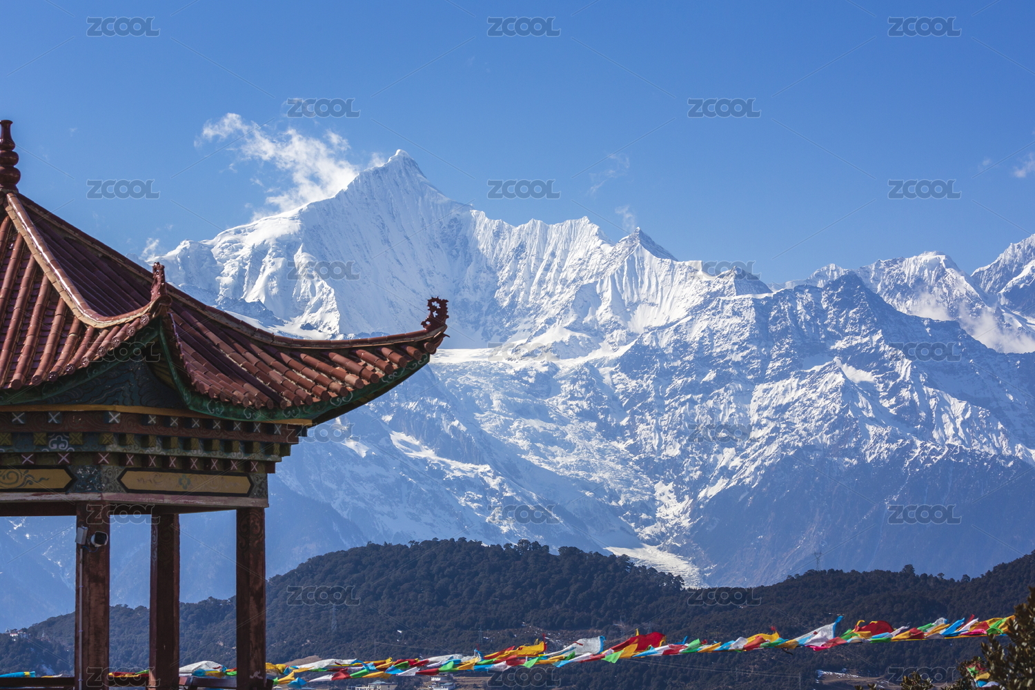 云南德钦梅里雪山卡瓦格博山峰与凉亭