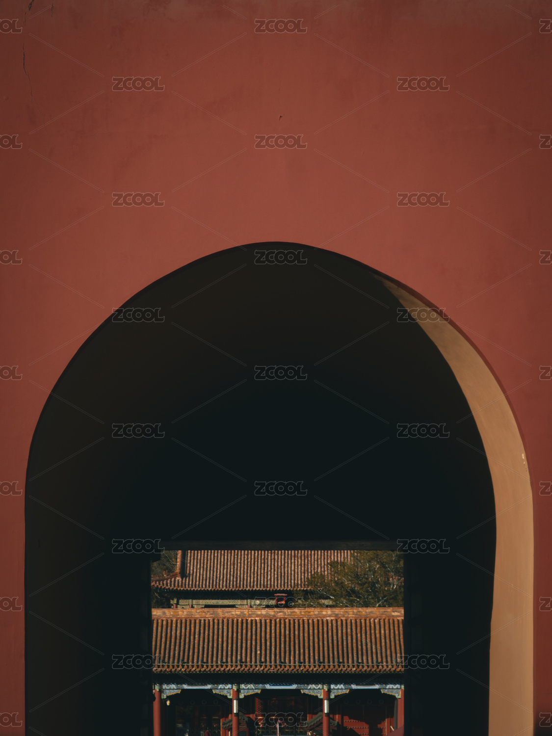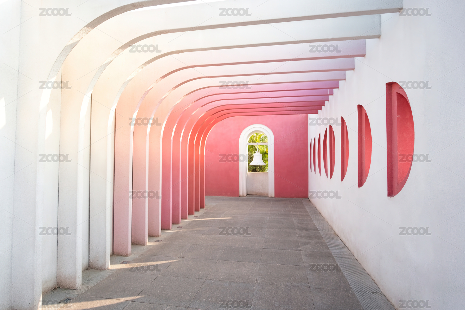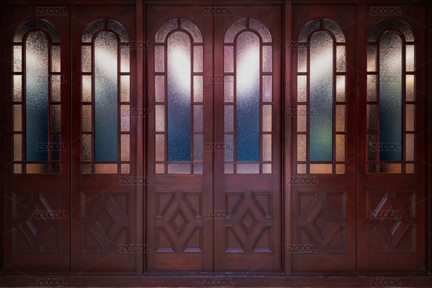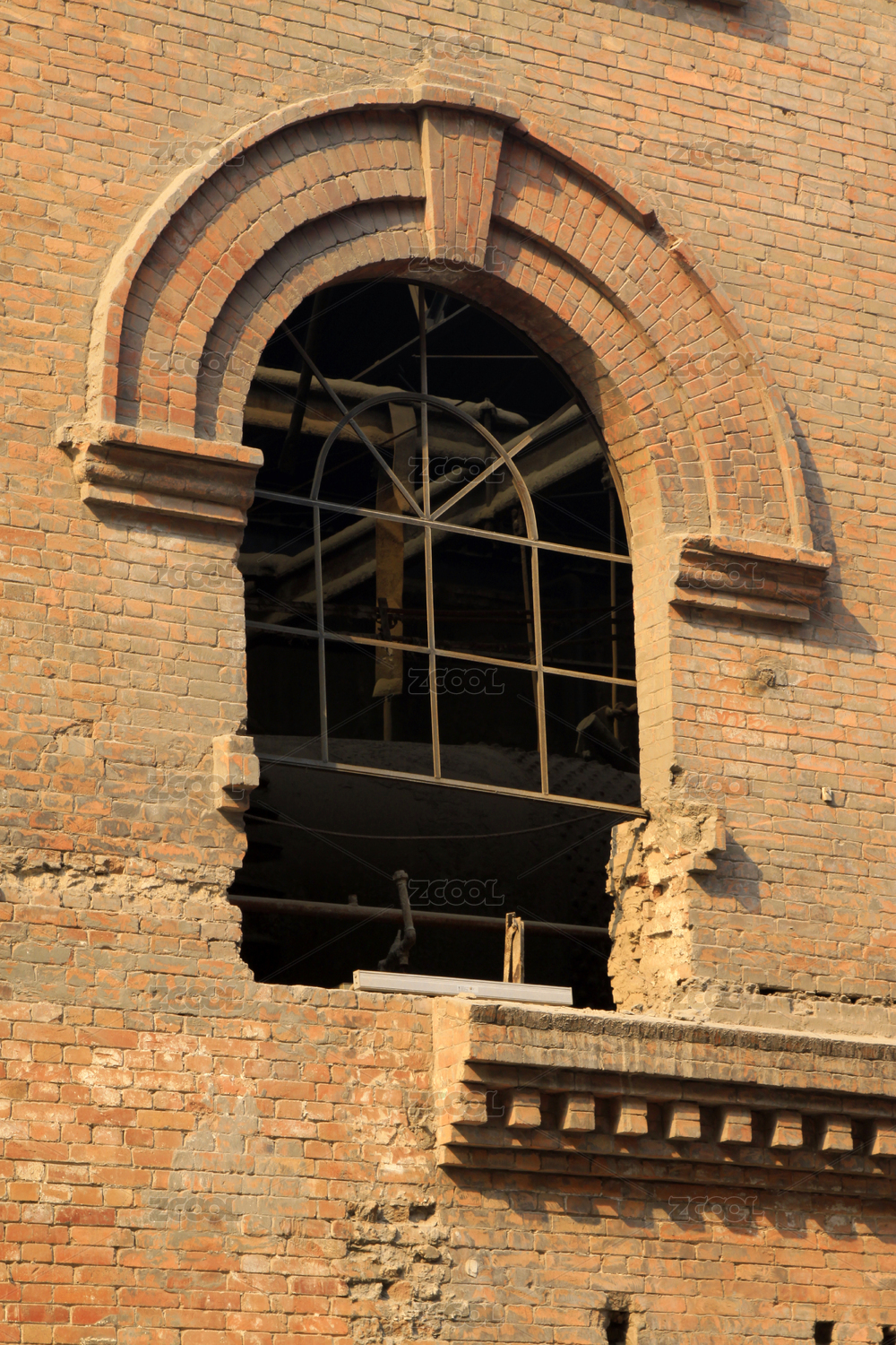 欧式老建筑的红砖墙面及拱形玻璃窗