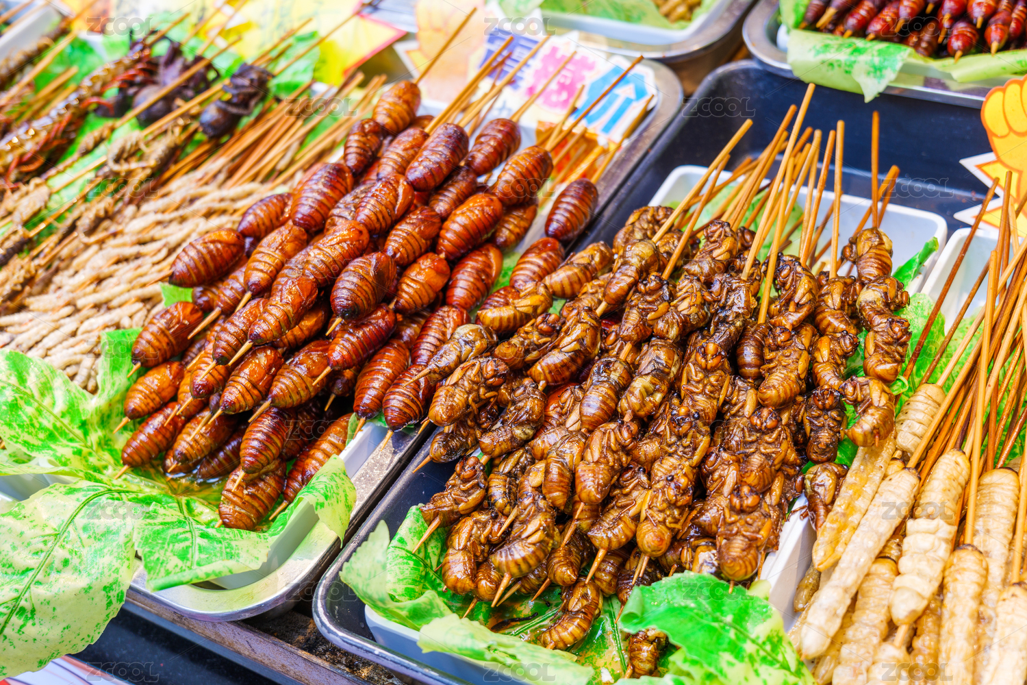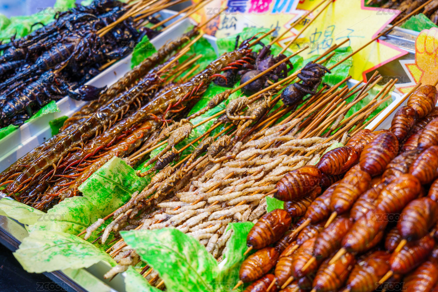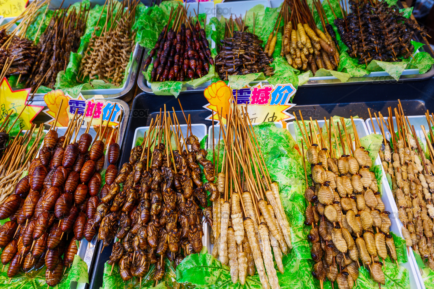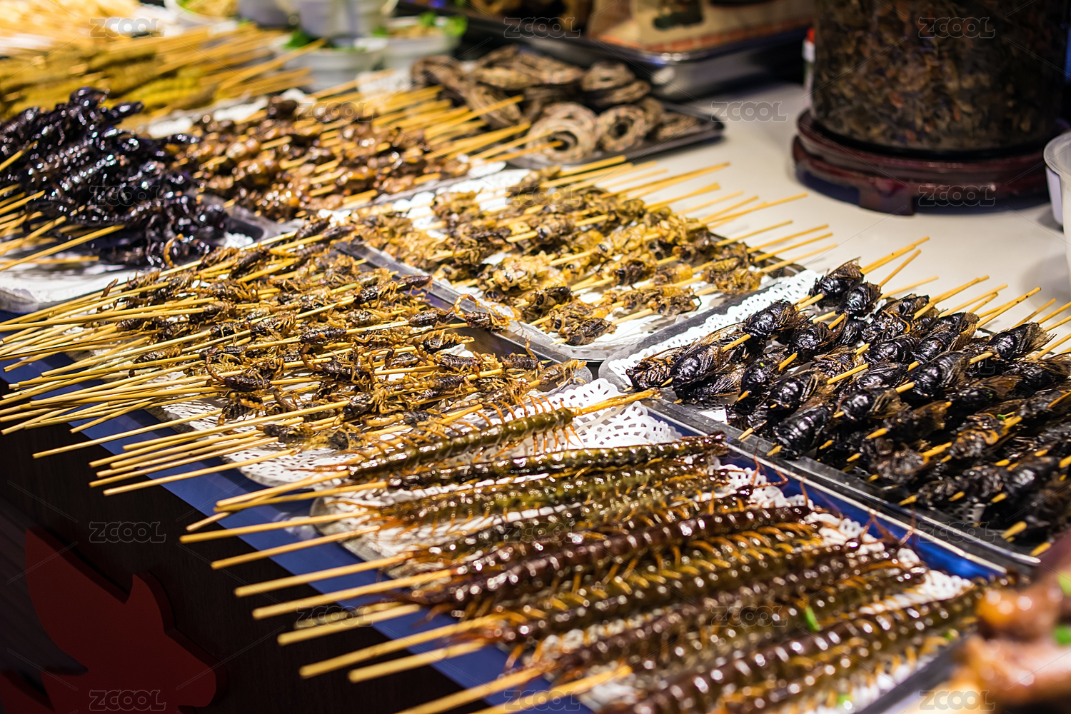 烧烤店内排排油炸食品,昆虫宴炸蝎子炸蜈蚣