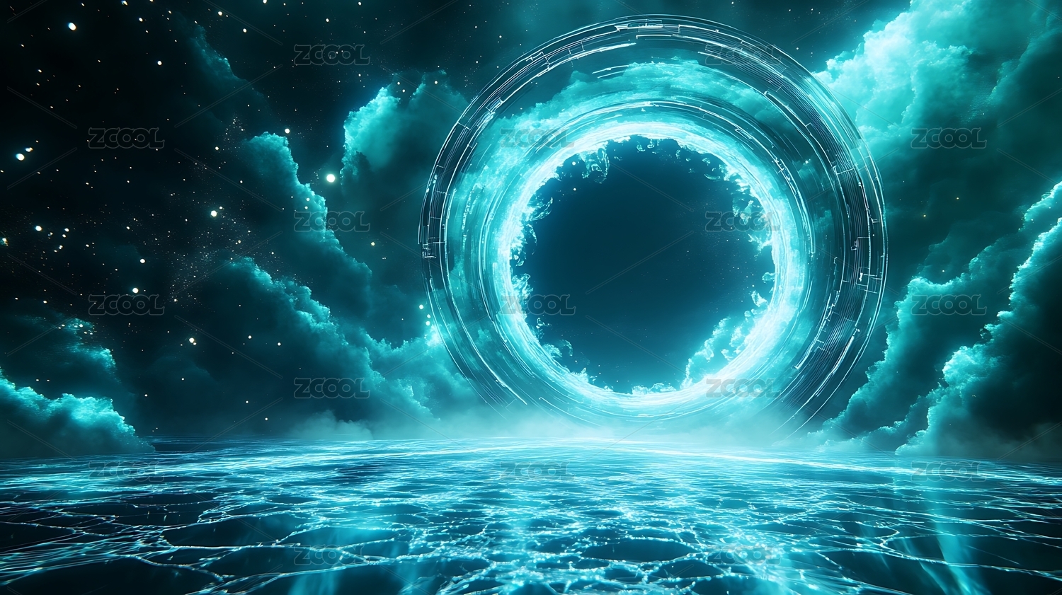 未来科技感的时空传送门与水面倒影