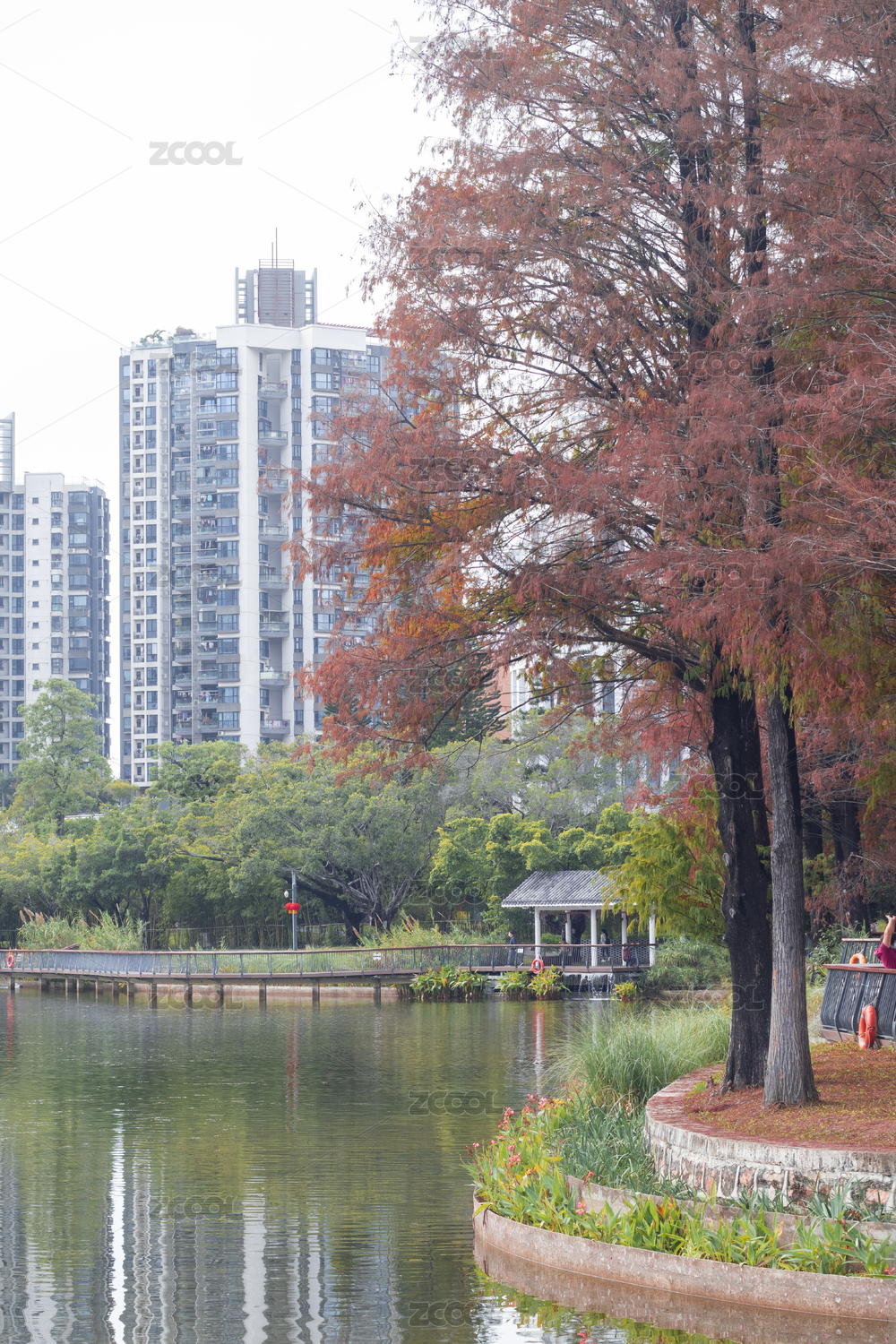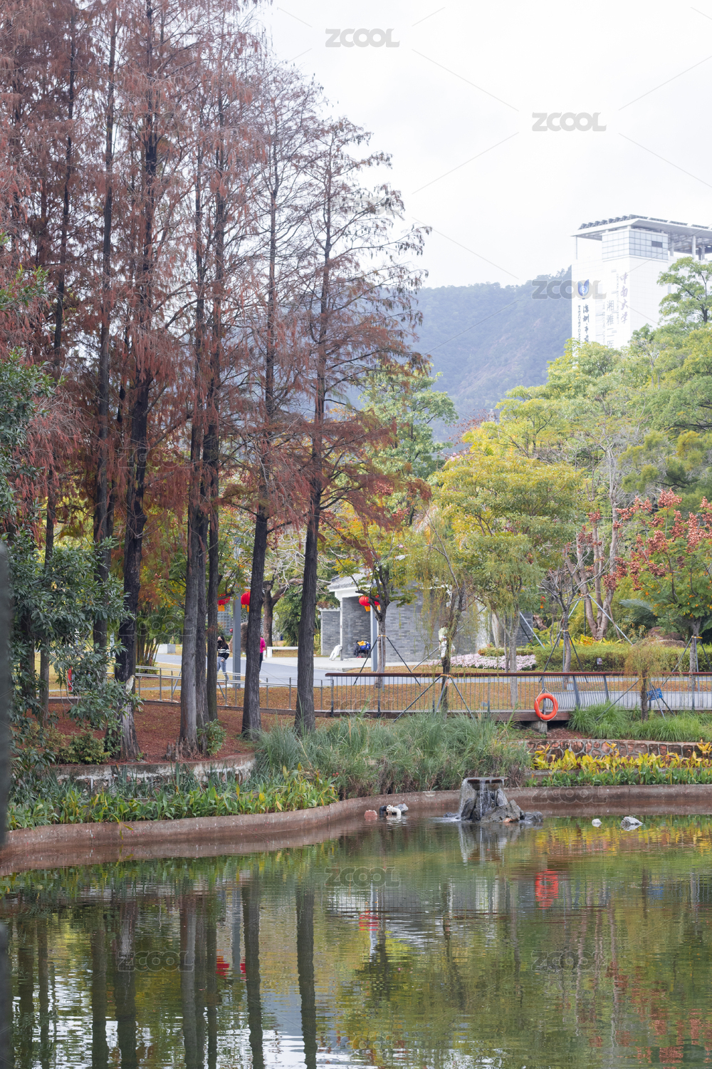 秋天的公园里水面上的亭子在水中倒影