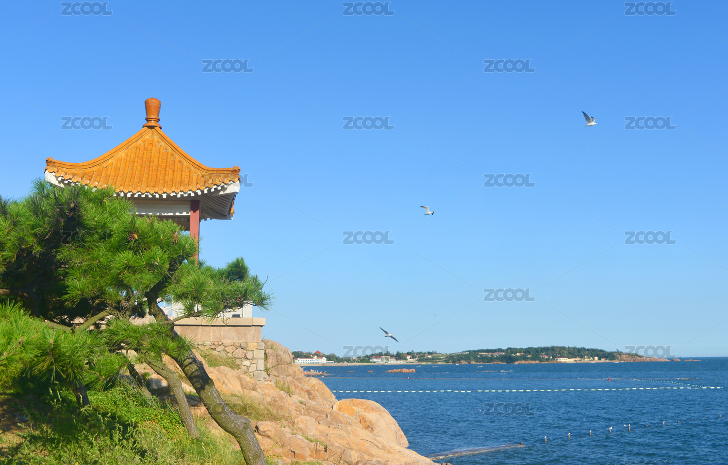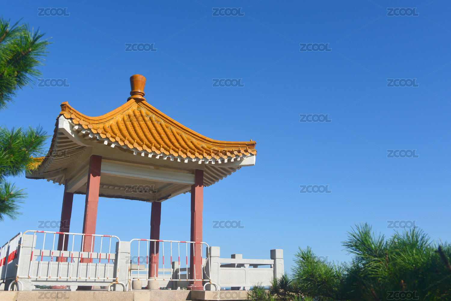 中国山东青岛太平湾海岸观景台琉璃瓦亭子