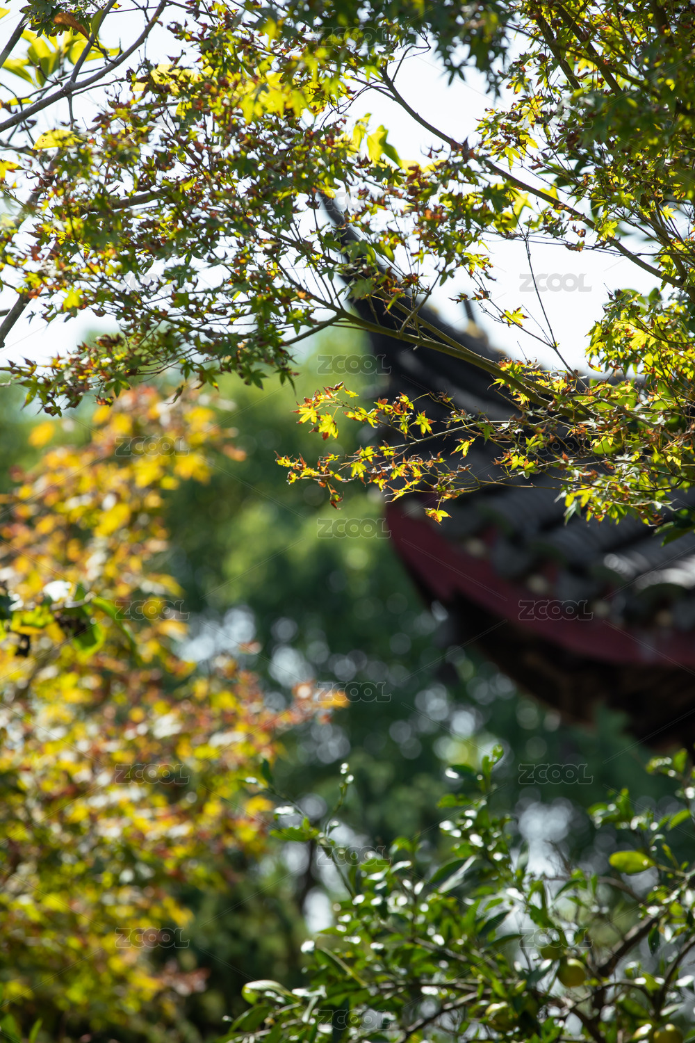 春天的绿叶与中国风亭台楼阁