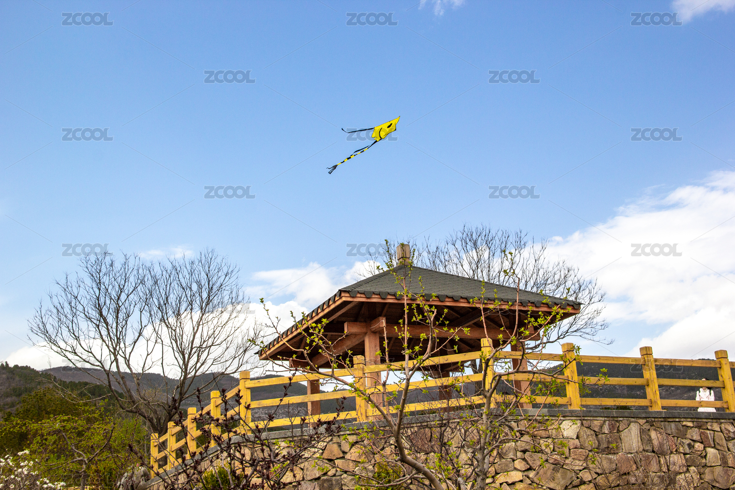 蓝天背景下的黄色风筝 公园亭子