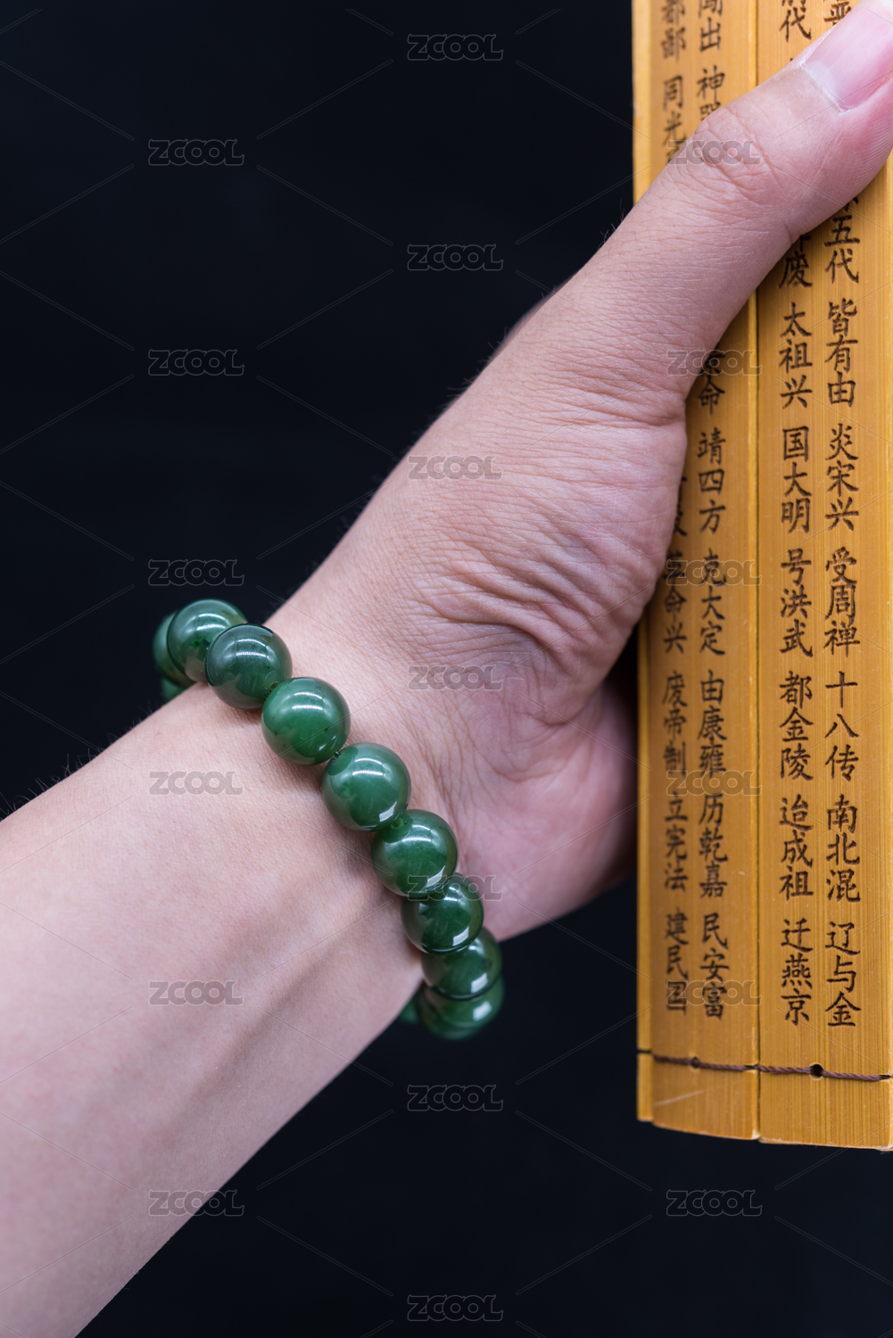 手腕上的玉石手串特写