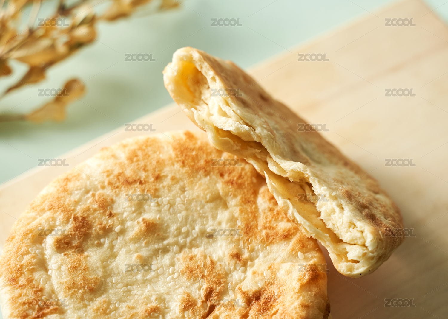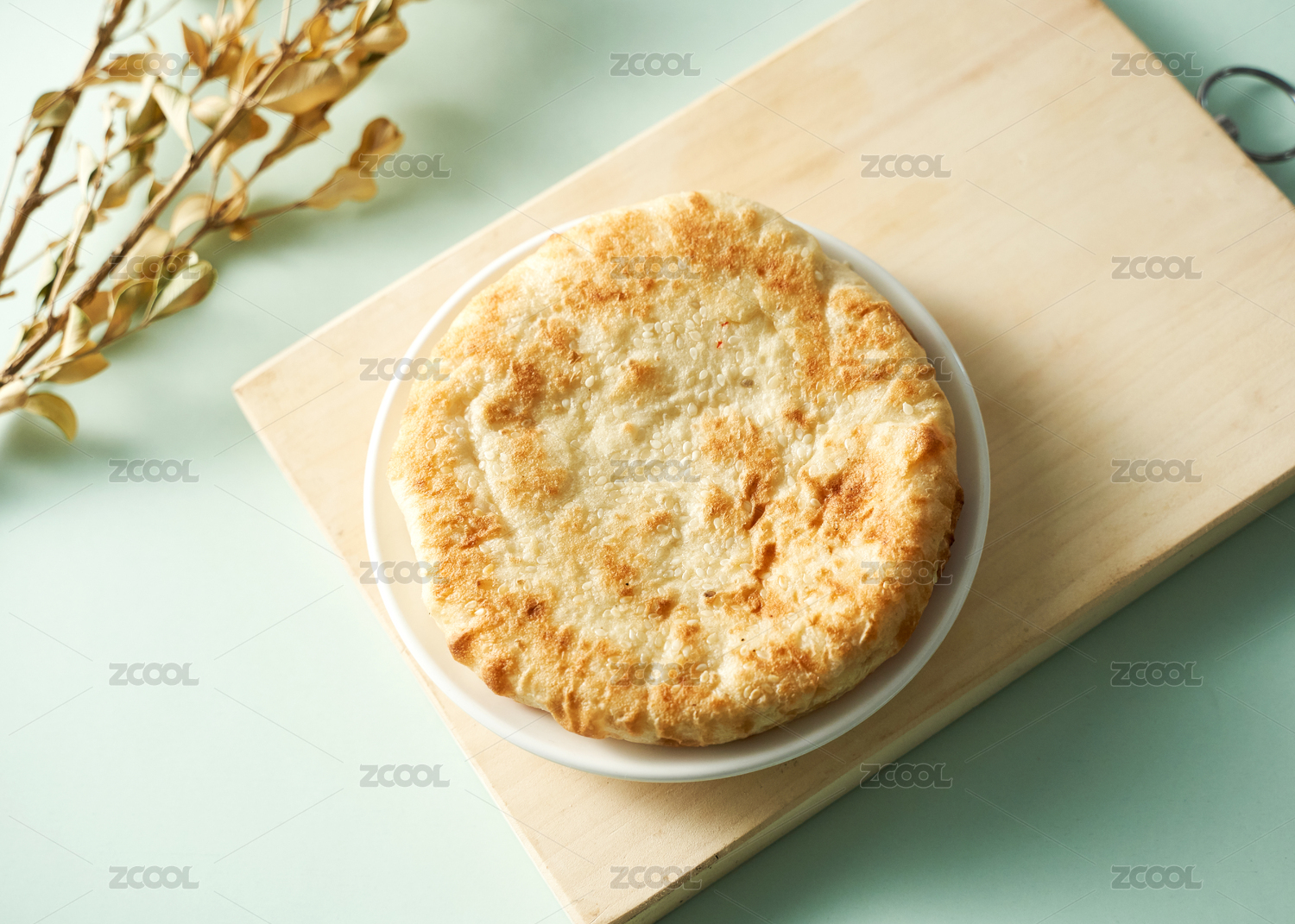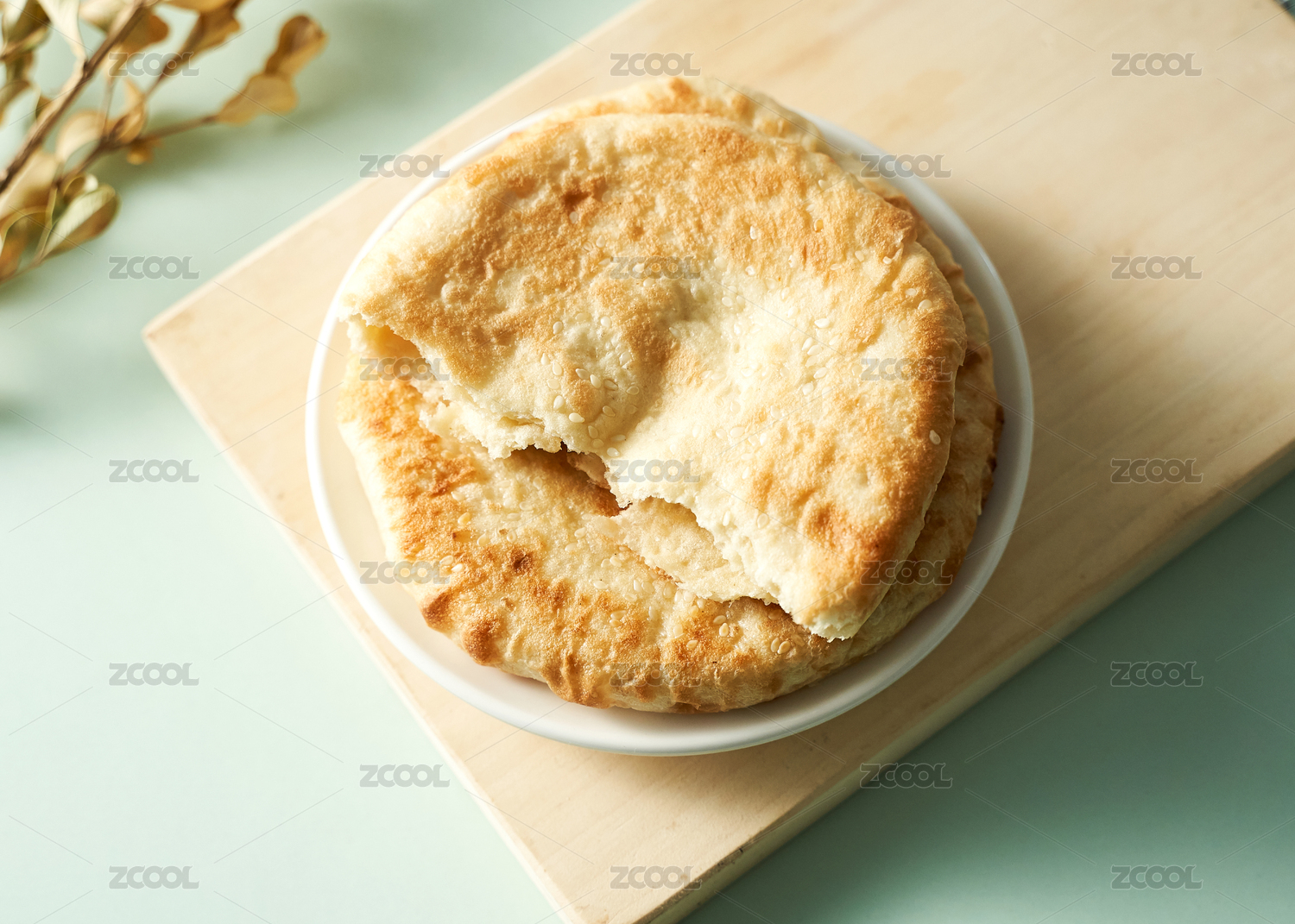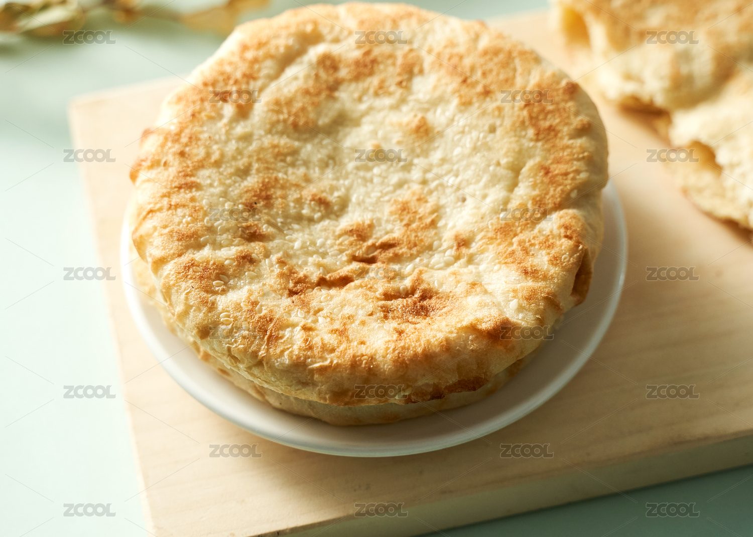 浅色背景上餐具上摆放的五香芝麻烧饼
