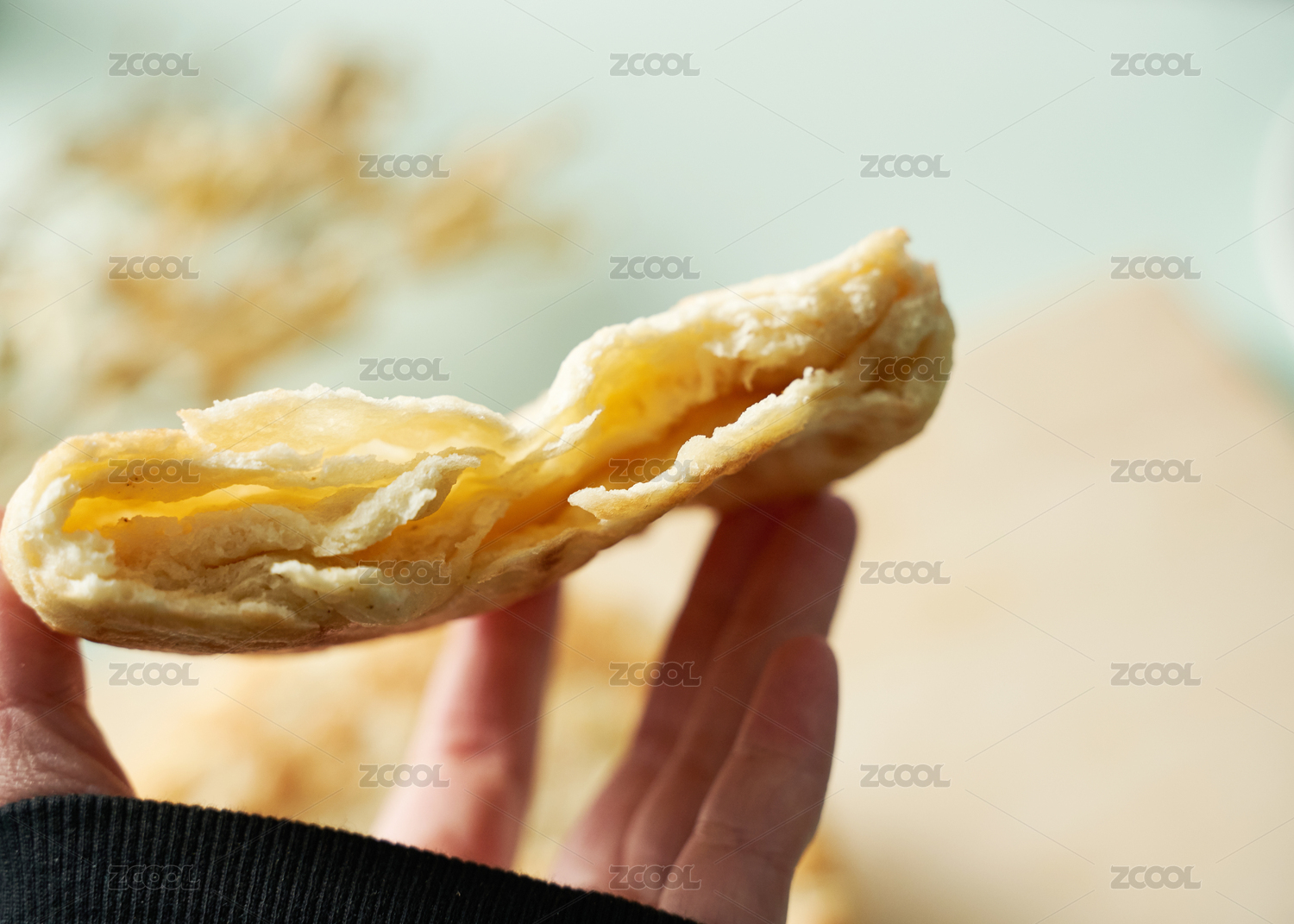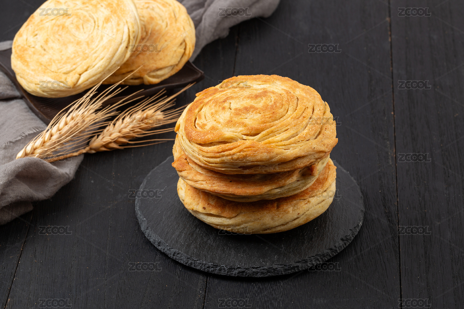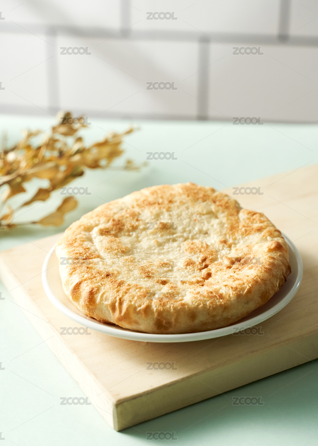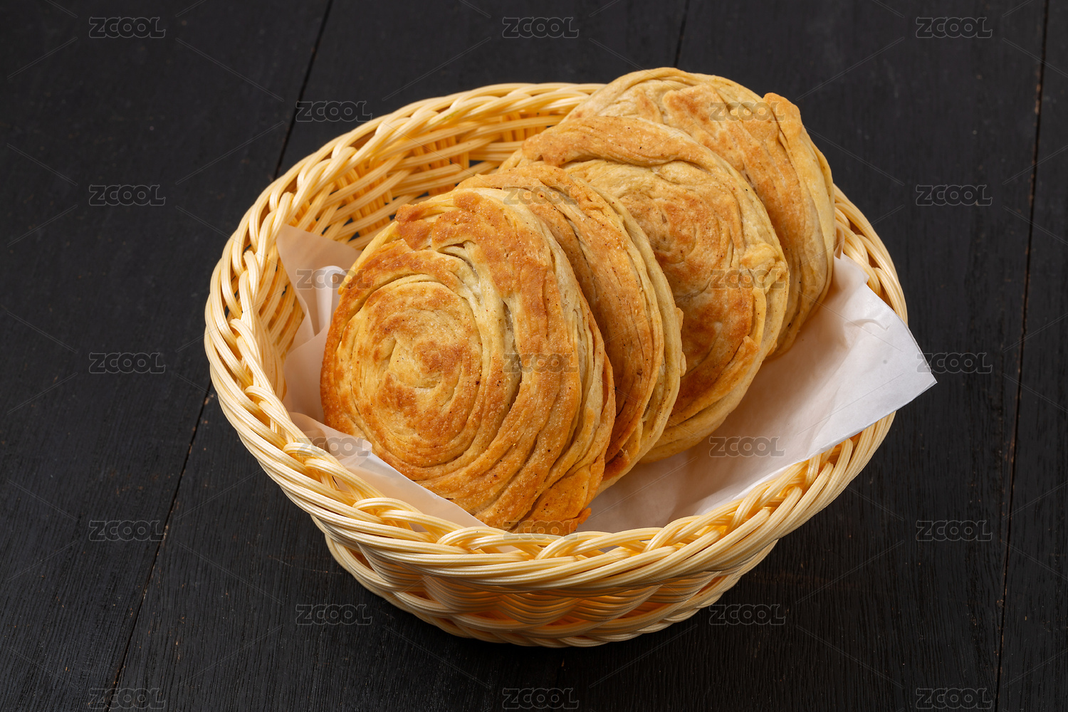 浅色背景上餐具上摆放的五香芝麻烧饼