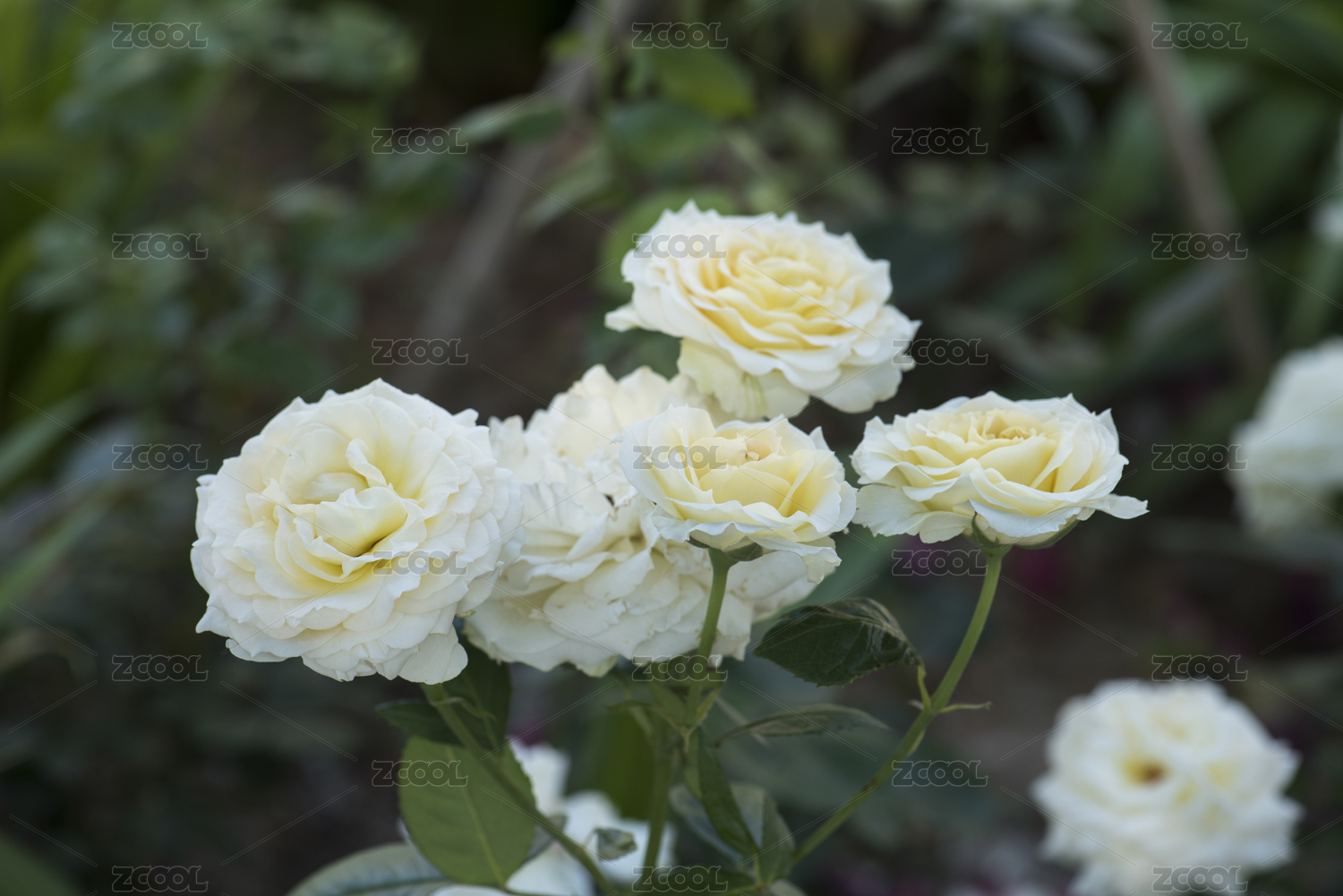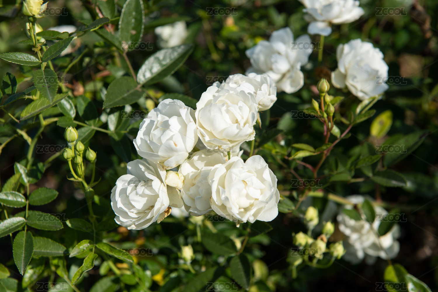 清晨花园里盛开的白色月季花