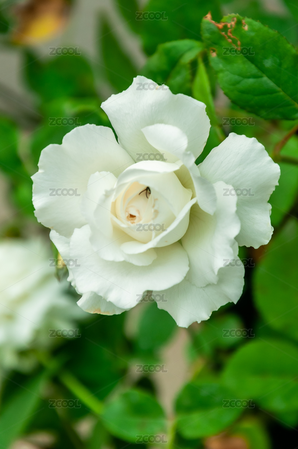 绿叶中一朵盛开的白色月季花