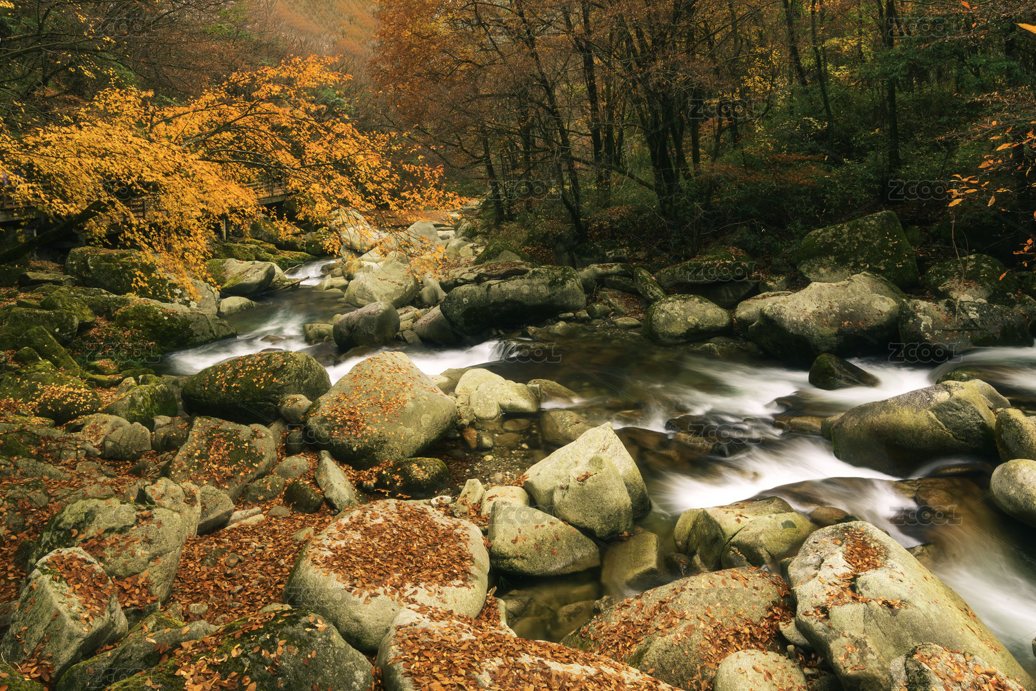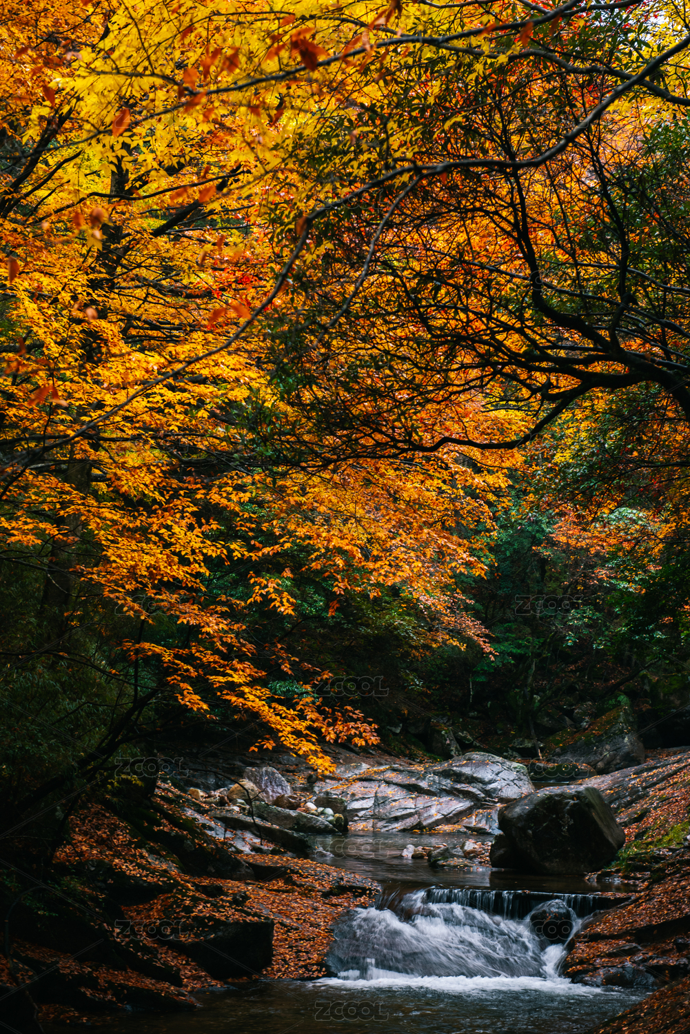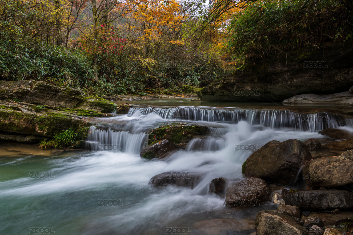 中国秋天四川巴中光雾山金色彩林与溪流