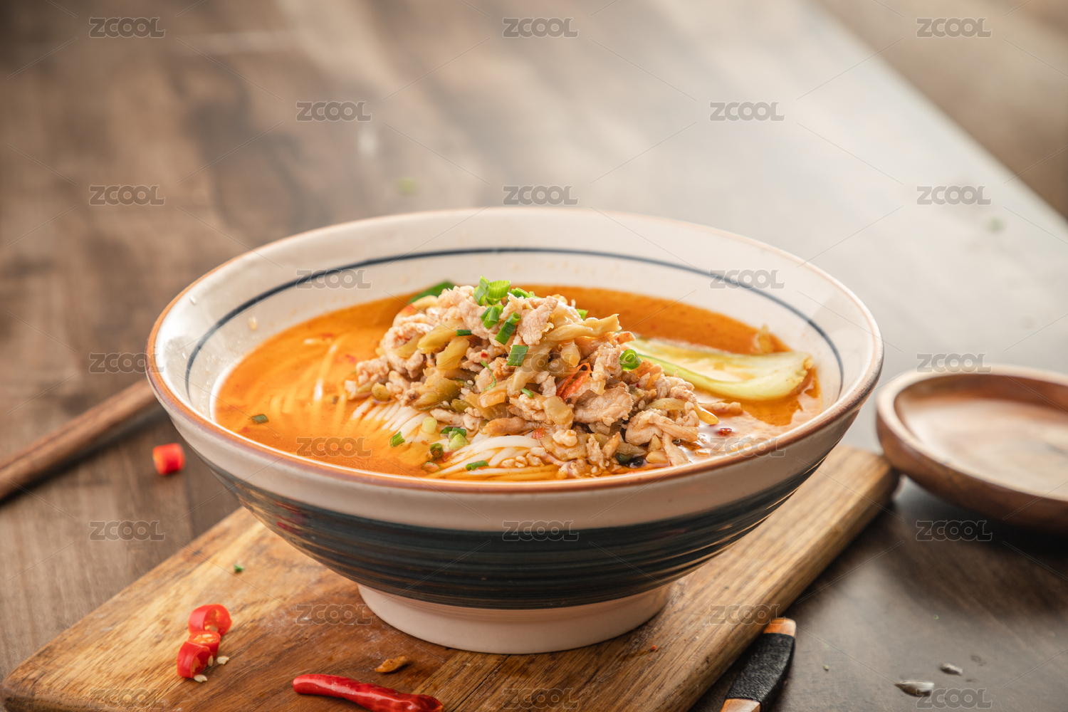 棕色木纹板上放着一碗榨菜肉丝米粉