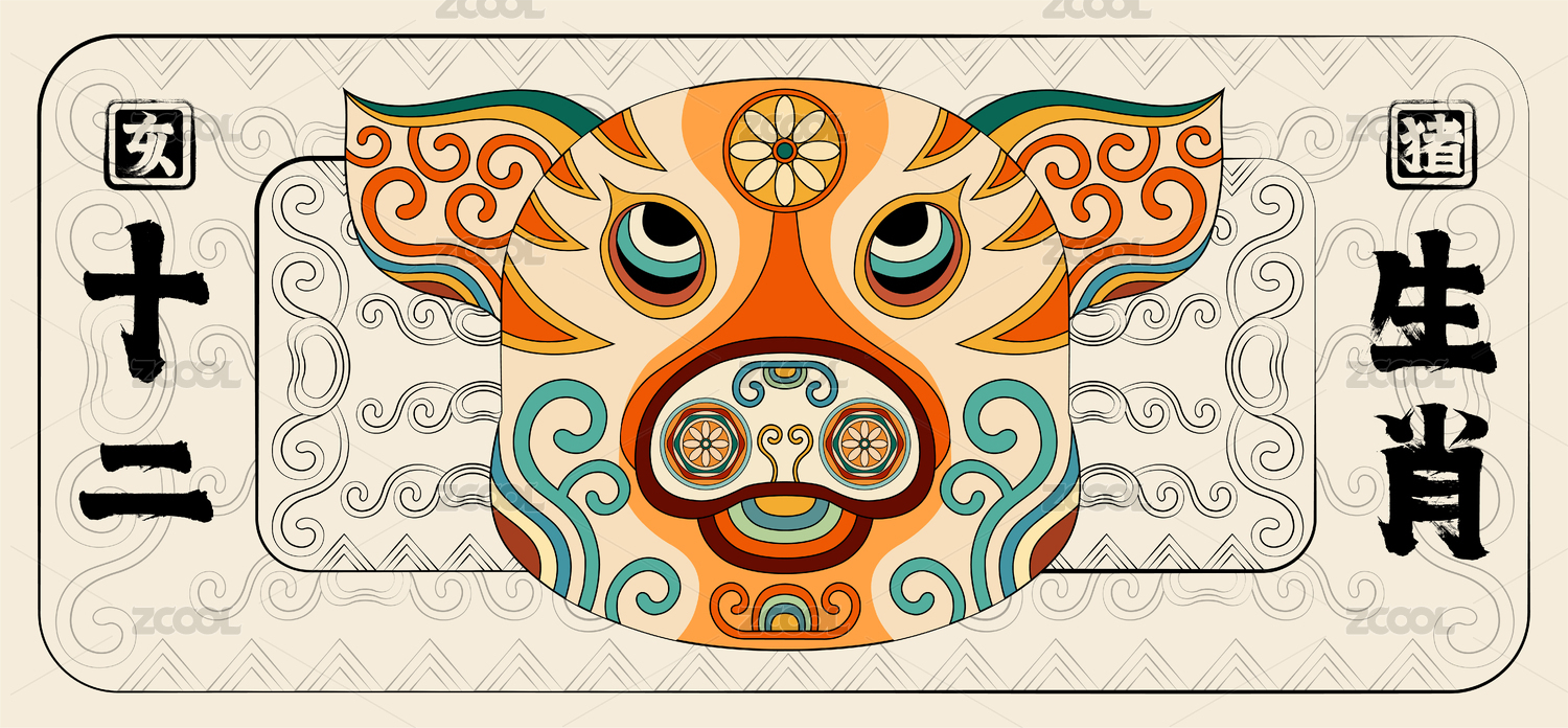 猪十二生肖简约潮流中国风传统纹样矢量插画