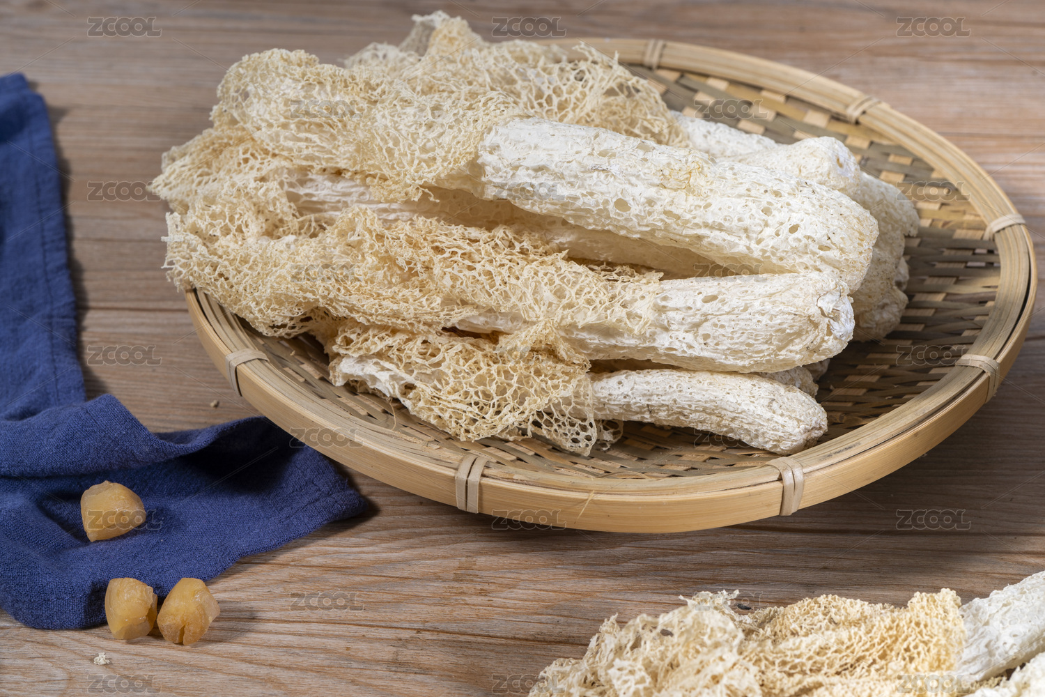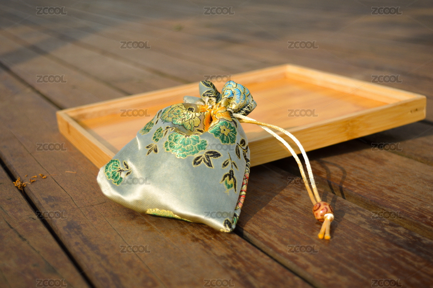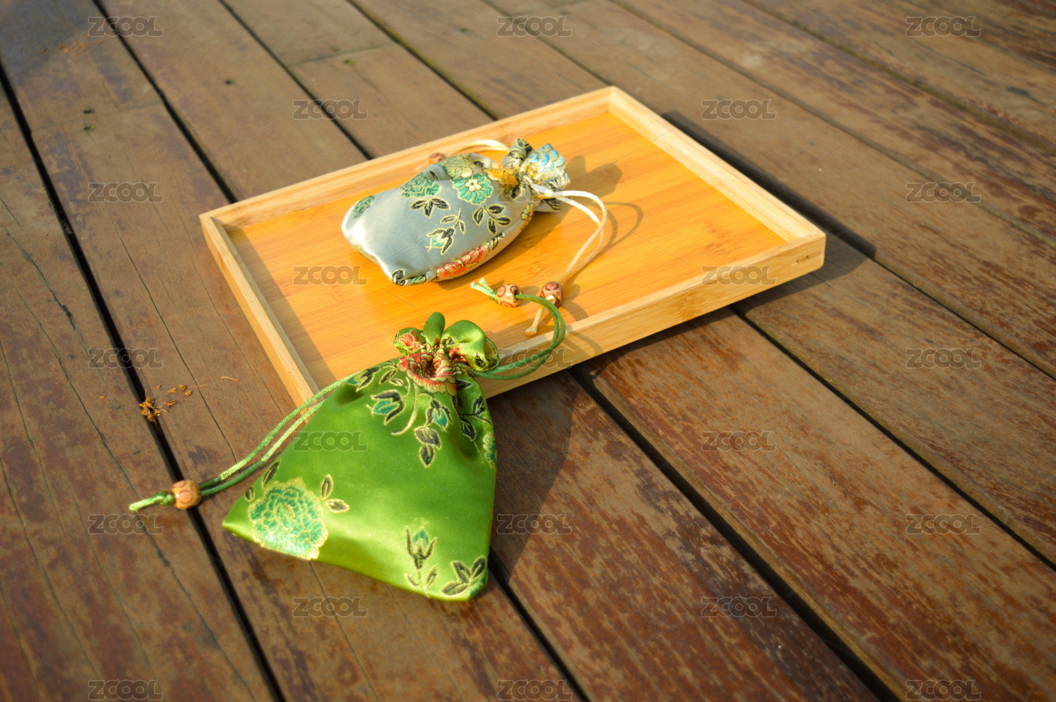 放在原木色盘子里的米白色刺绣锦囊和旁边的绿色刺绣锦囊