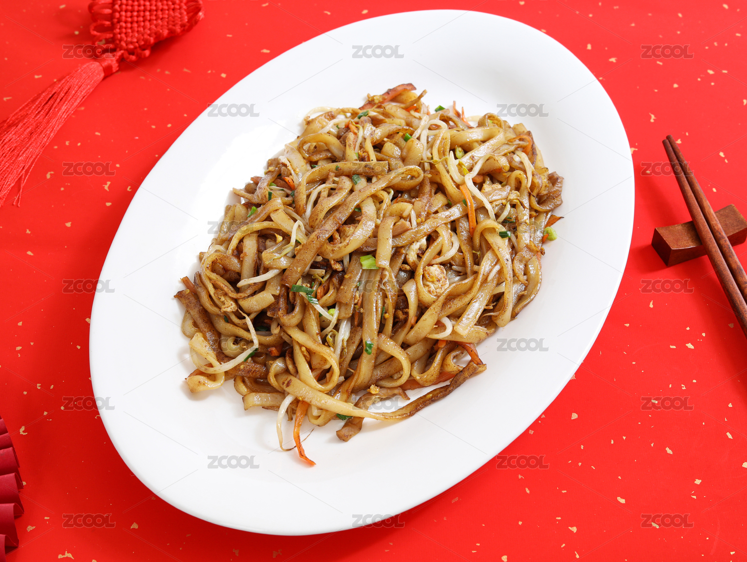 红色桌面上的一盘子广东特色美食宵夜炒河粉