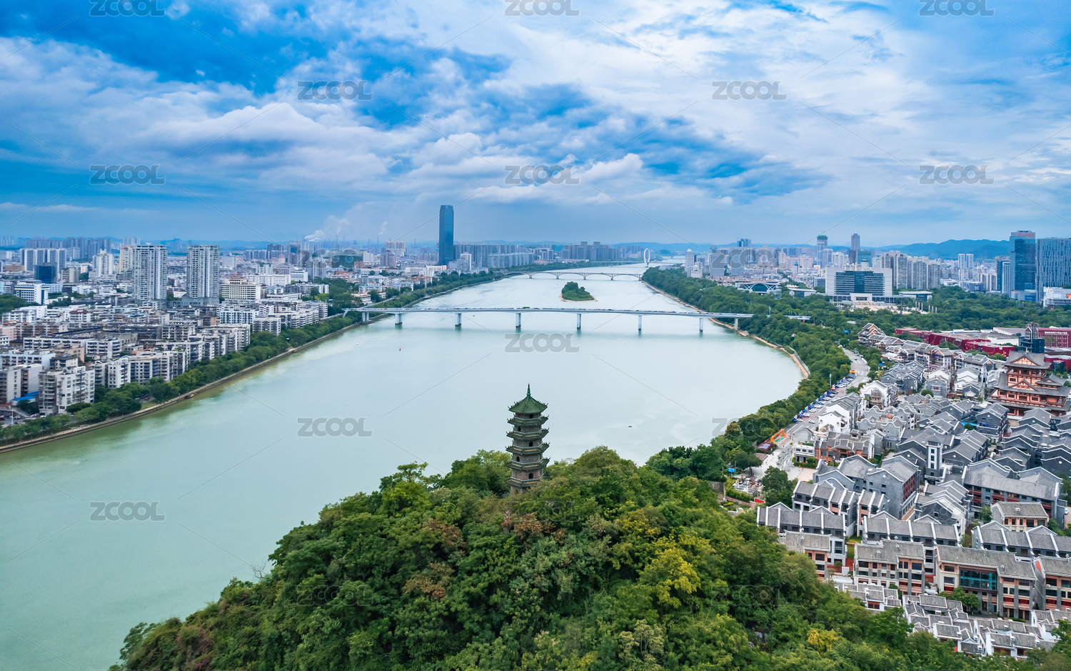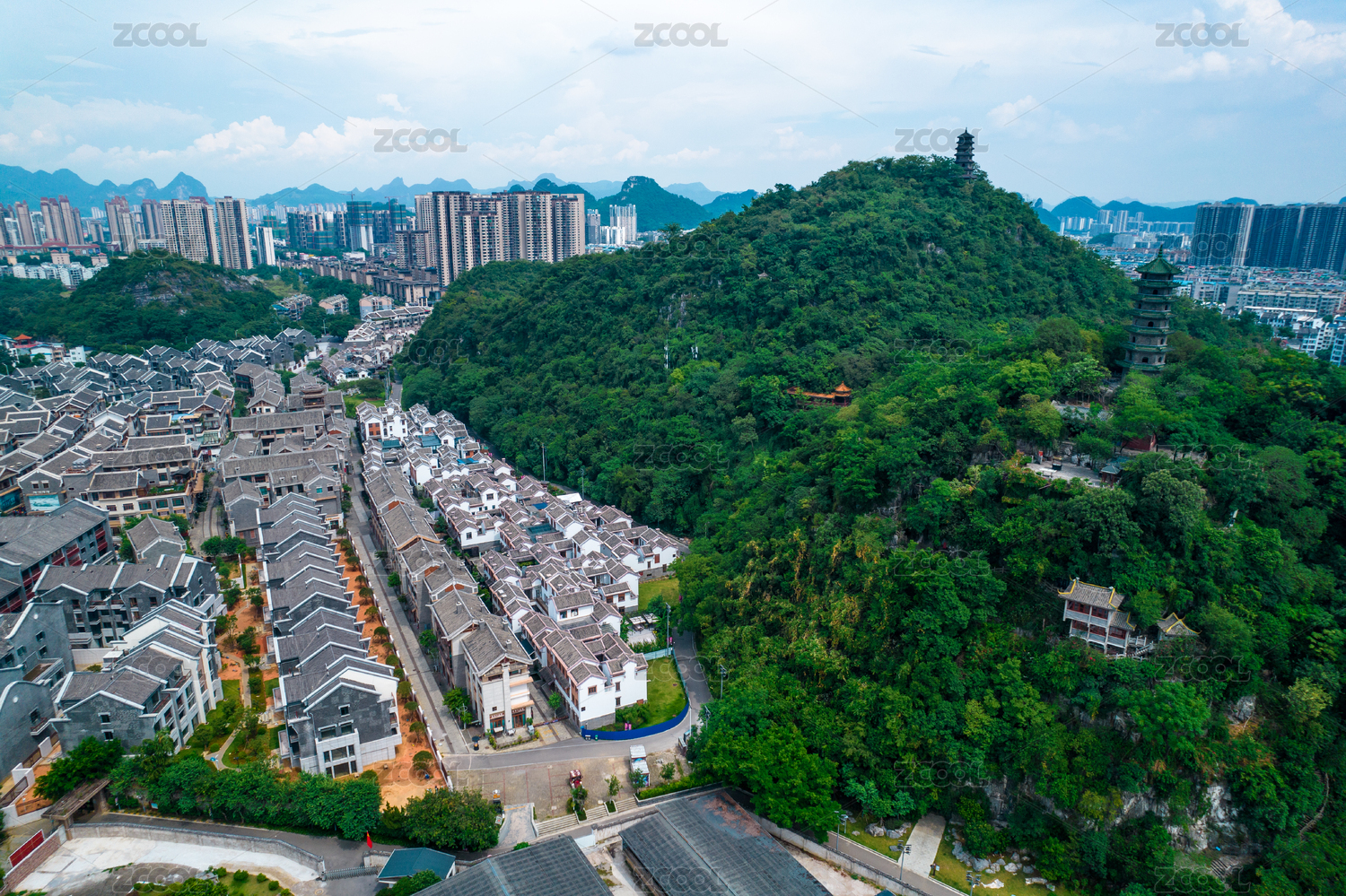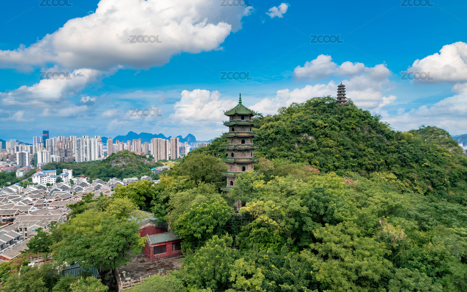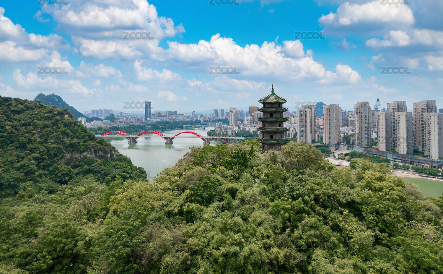 从柳州蟠龙山文光塔内望向远处的摩天大楼