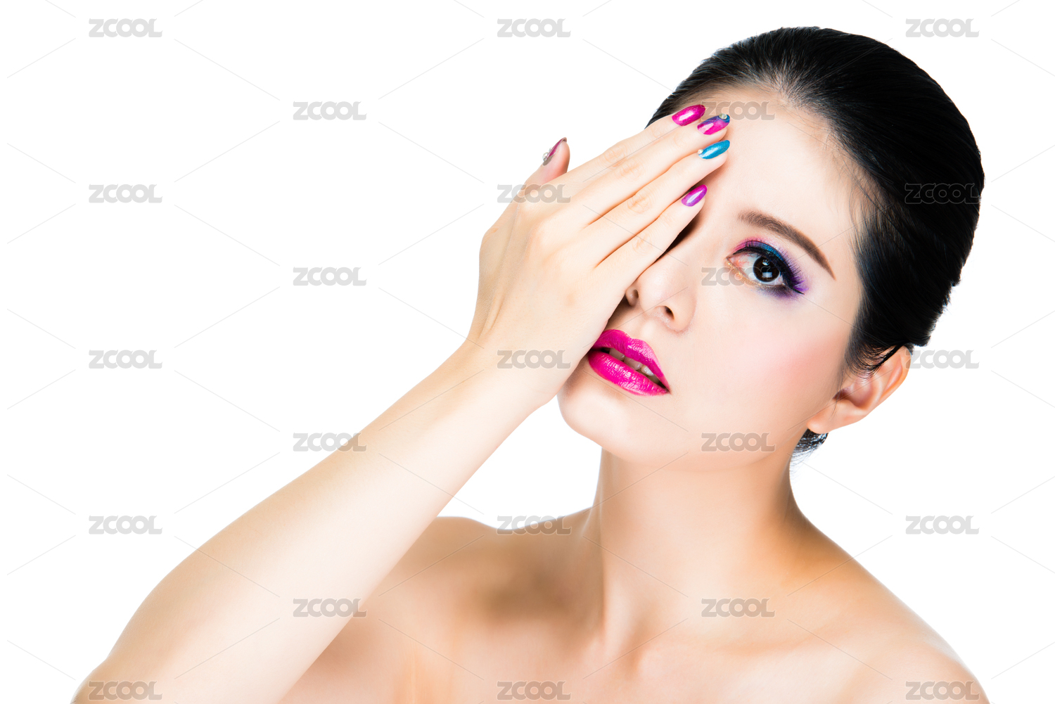 漂亮的亚洲女人化妆用粉色的唇膏和彩虹美甲彩绘。多变的女孩模型一方面盖眼呈现时尚的脸。