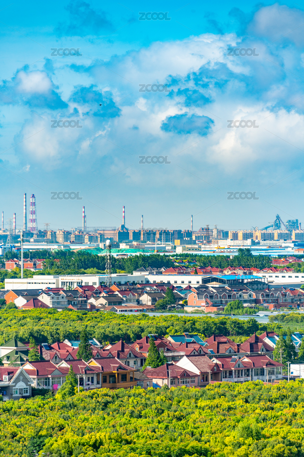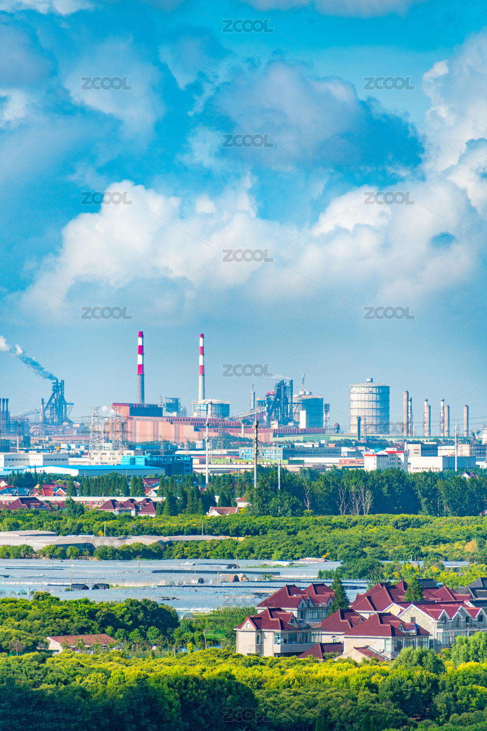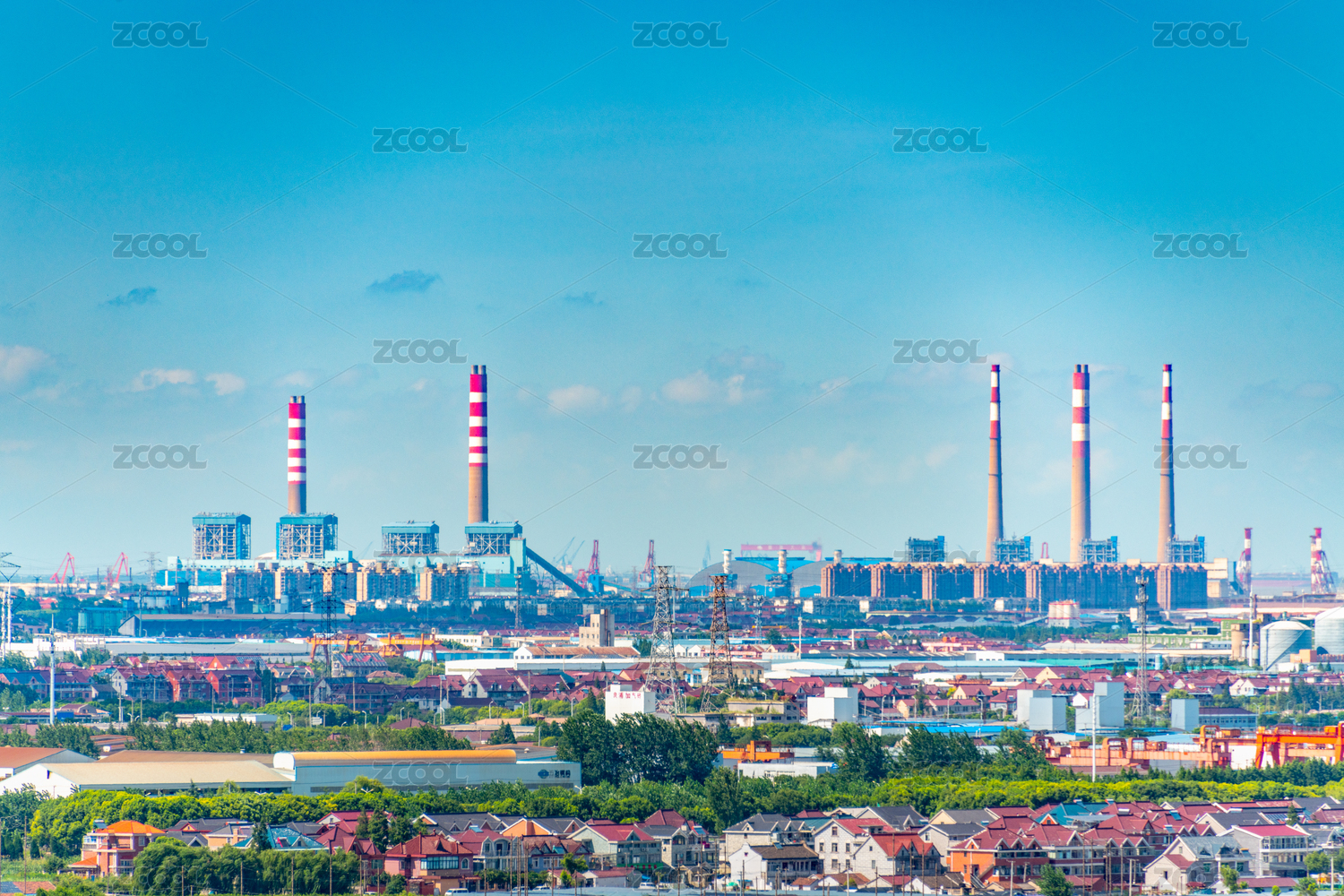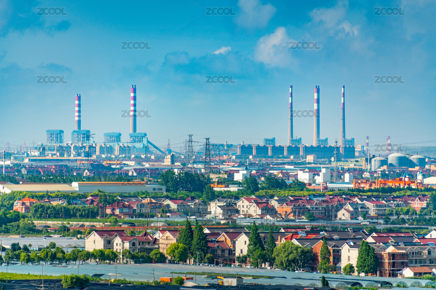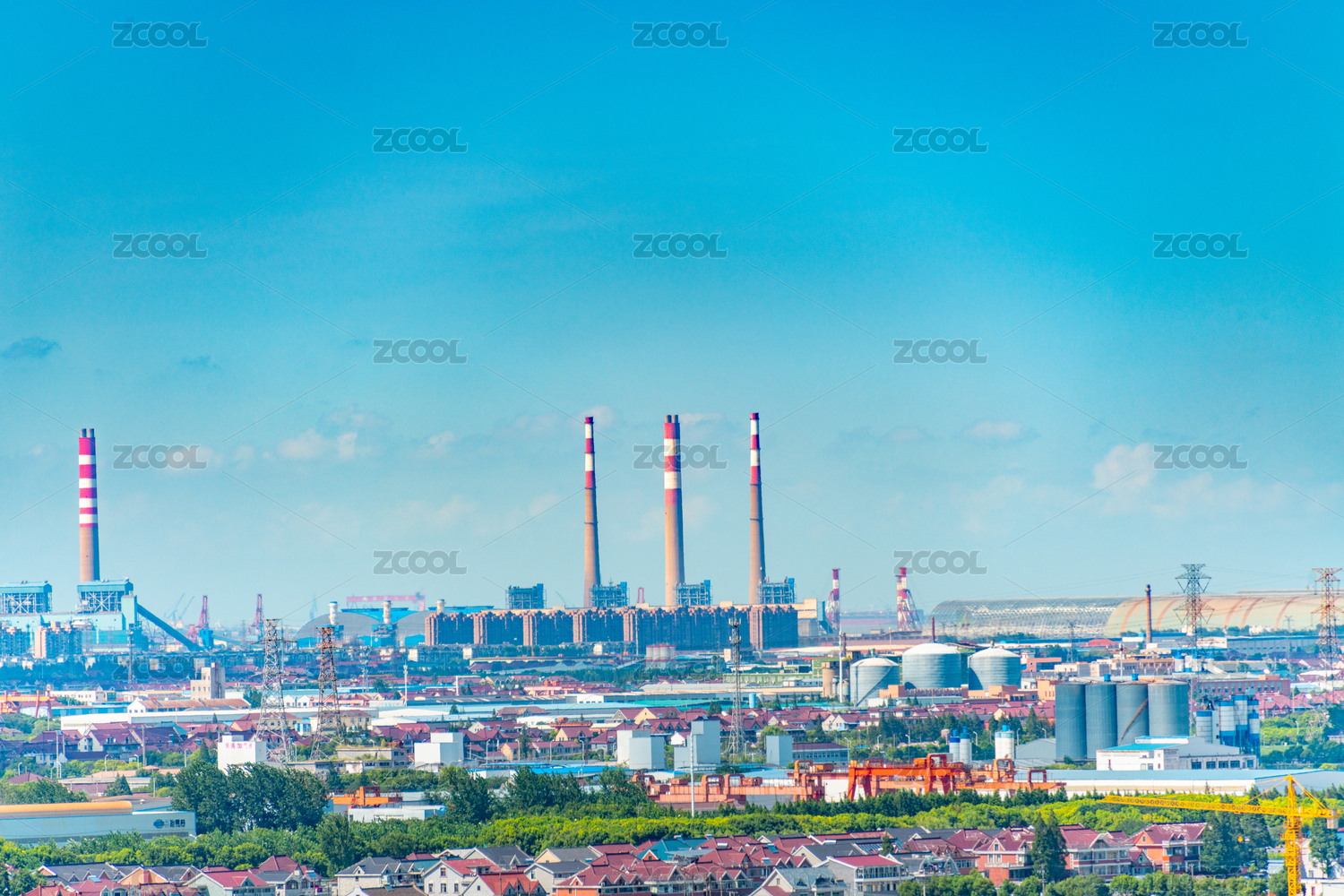 中国上海市的工业厂区和附近的民宅