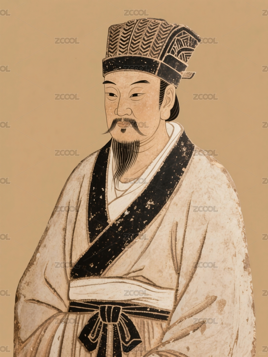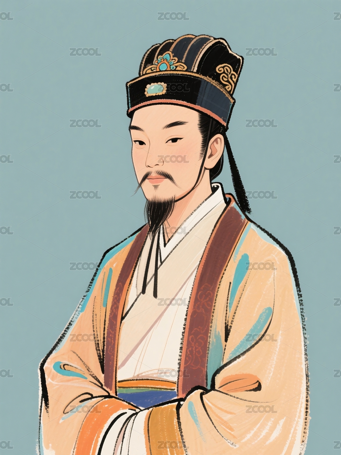 古代人物于谦手拿毛笔头载官帽,手绘插画