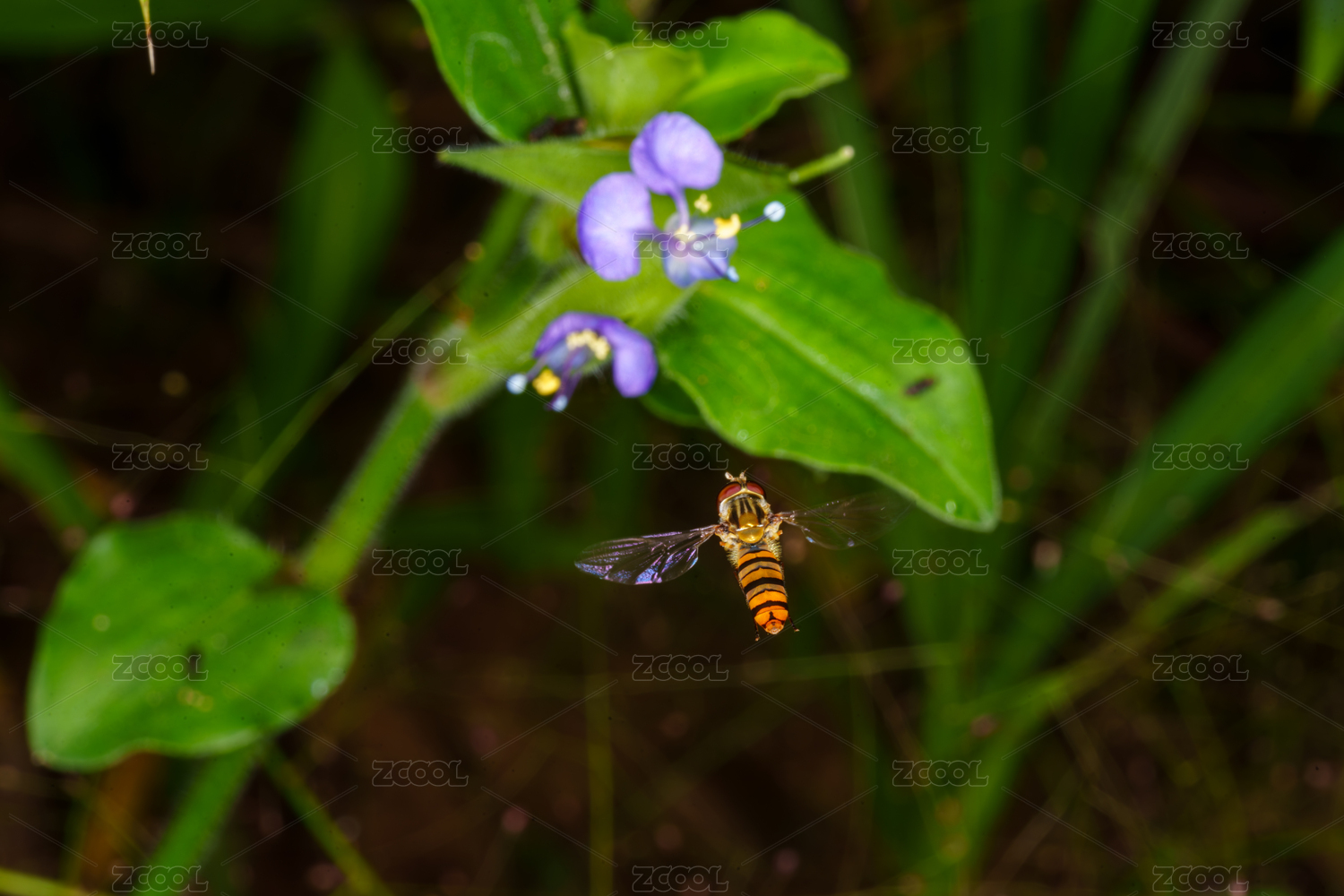 一只蜂鸟鹰蛾正悬停在花朵上采食花蜜