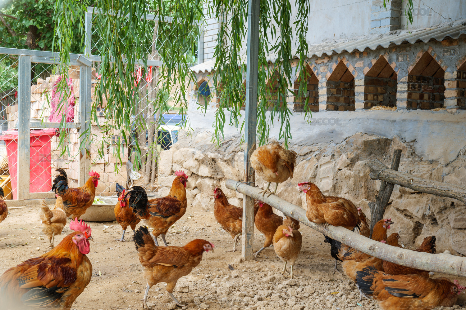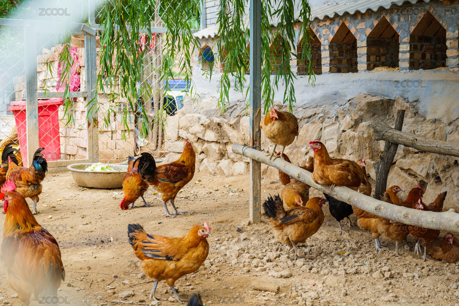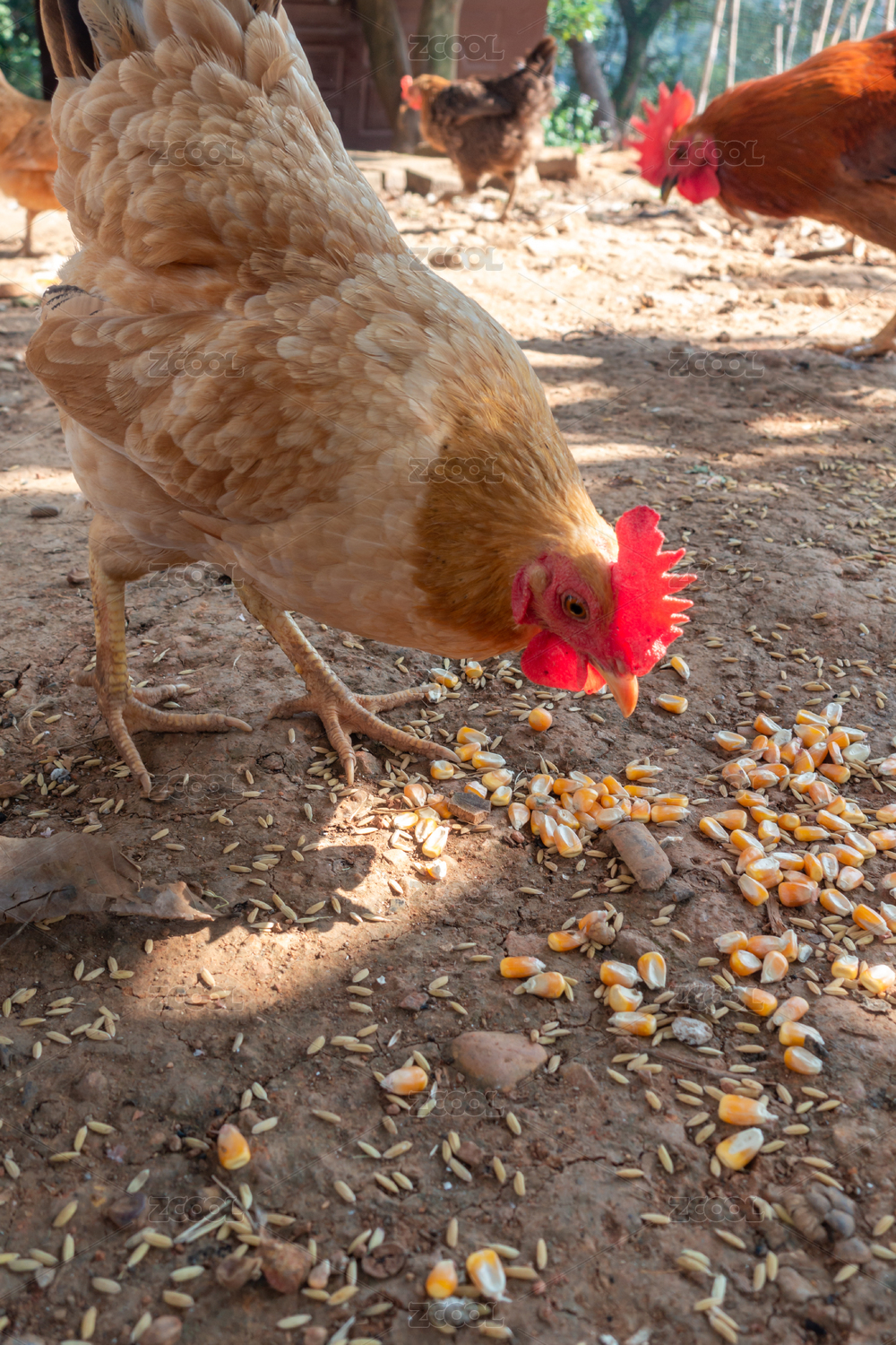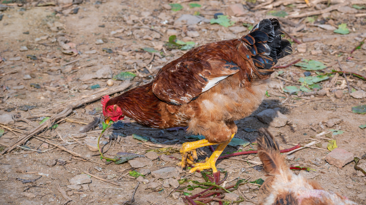 乡村农家饲养的土鸡 公鸡母鸡吃食