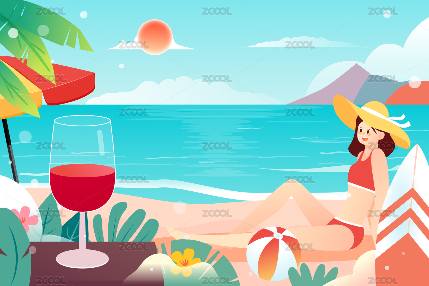立夏节气美女假期旅游夏天海边避暑海滩插画
