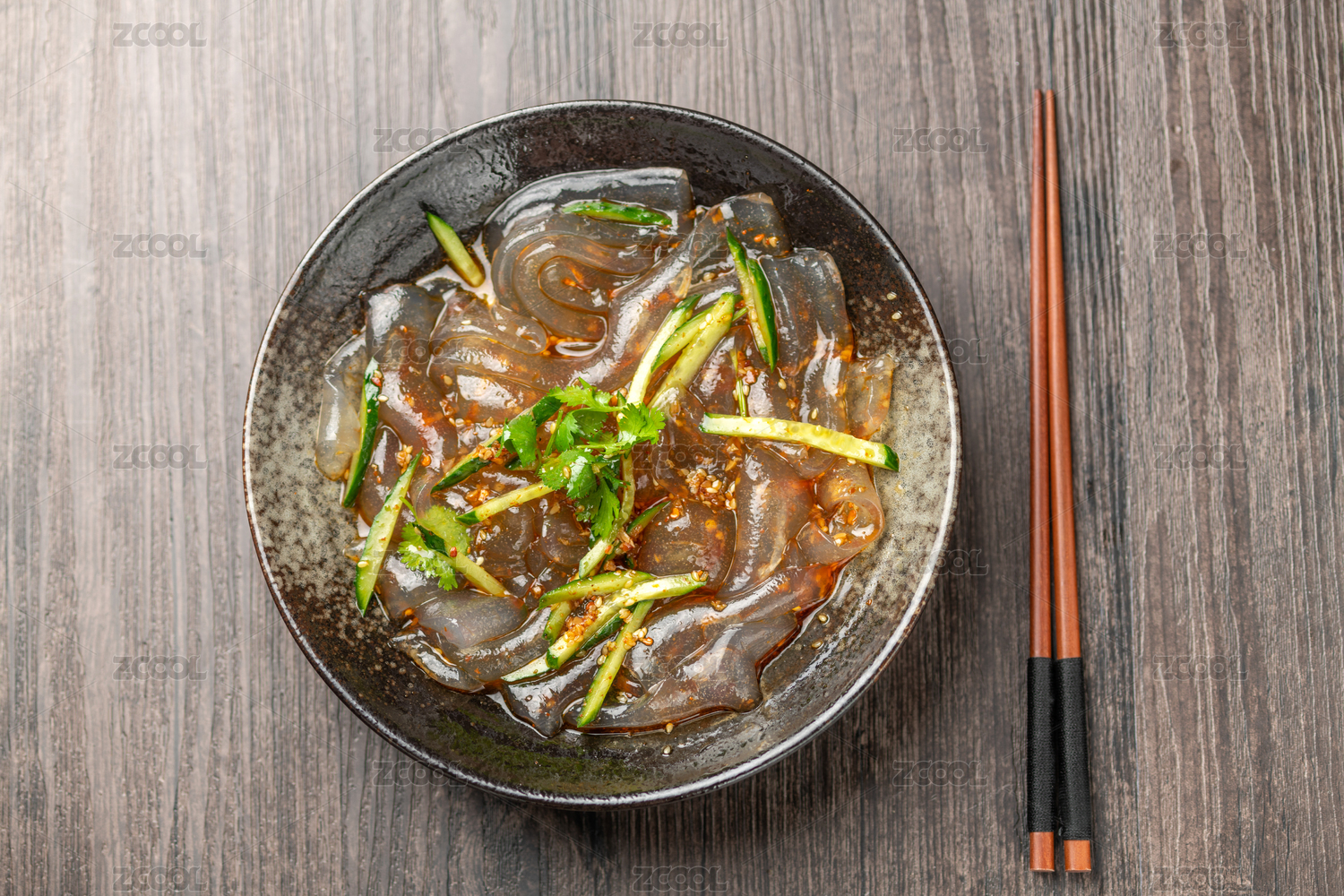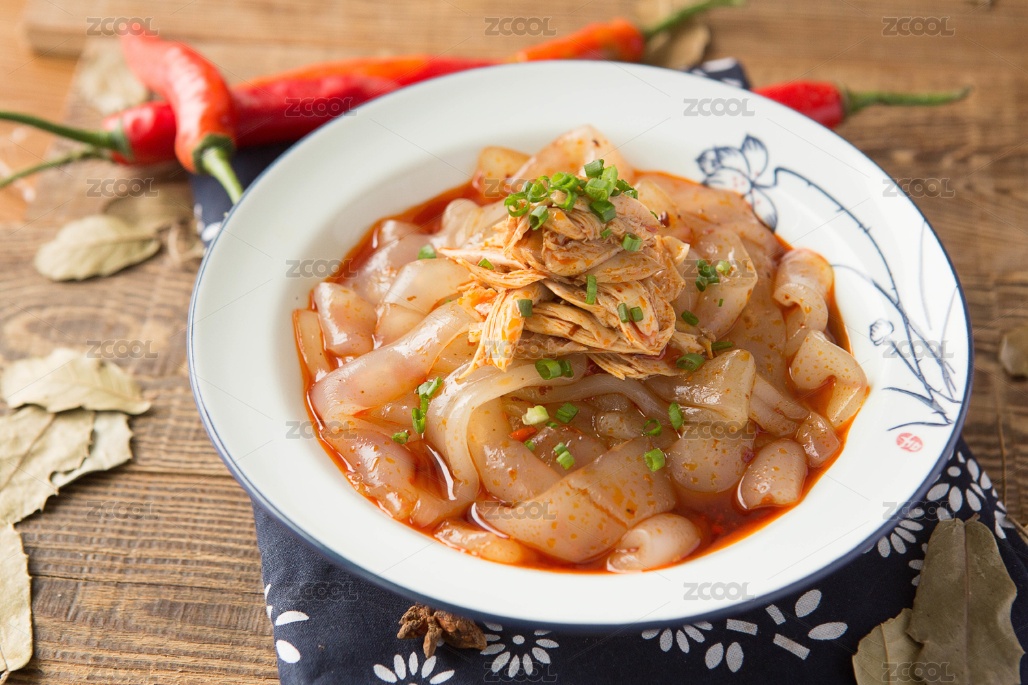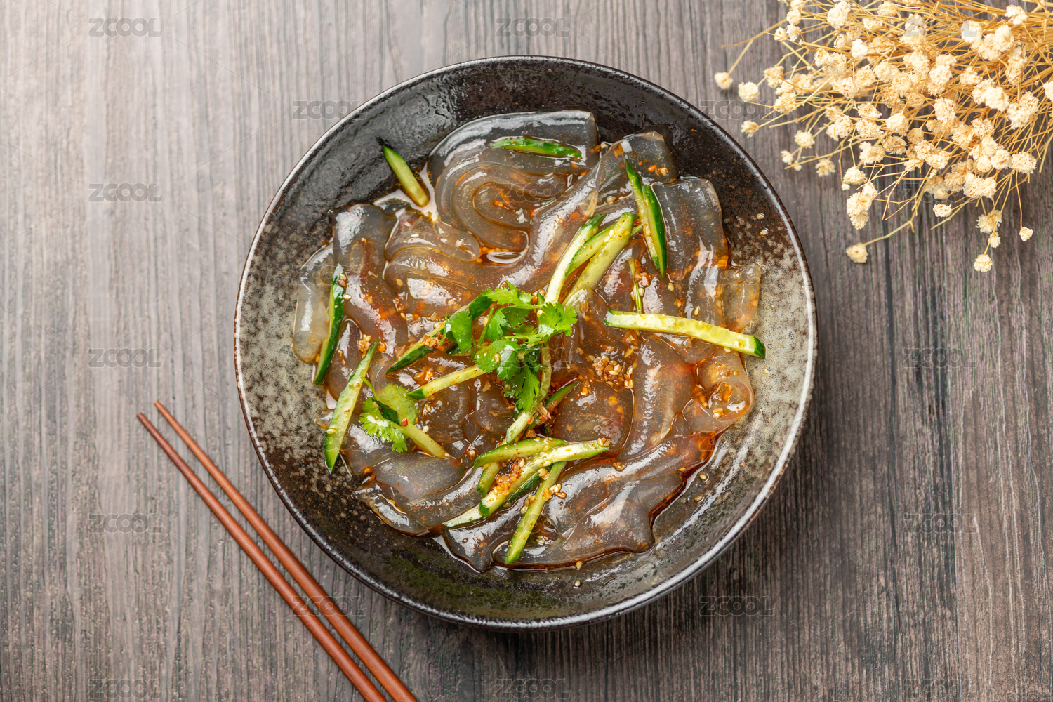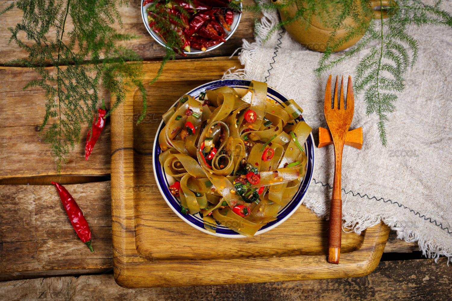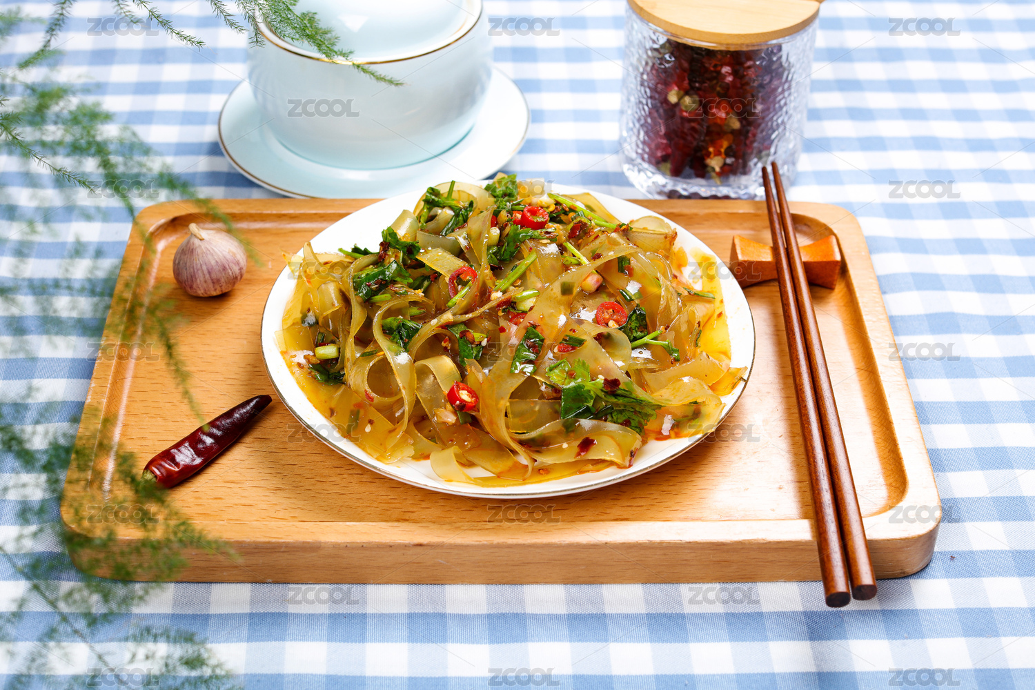 夏季凉菜川味粉皮拉皮特写木桌面背景