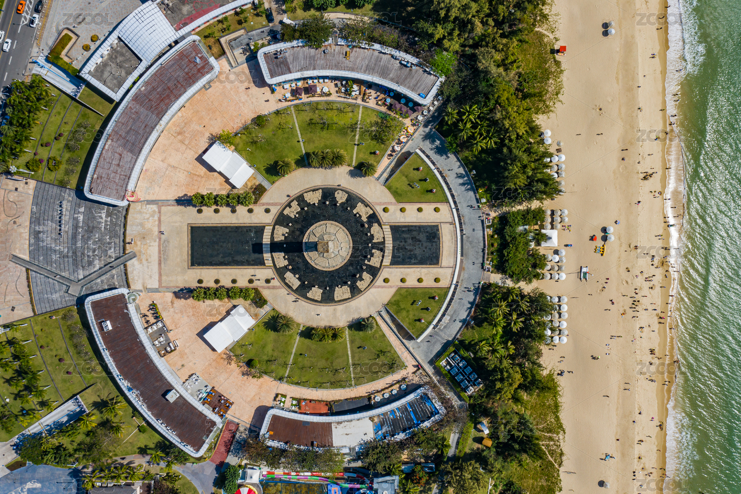 航拍海南三亚亚龙湾中心广场图腾柱地标建筑