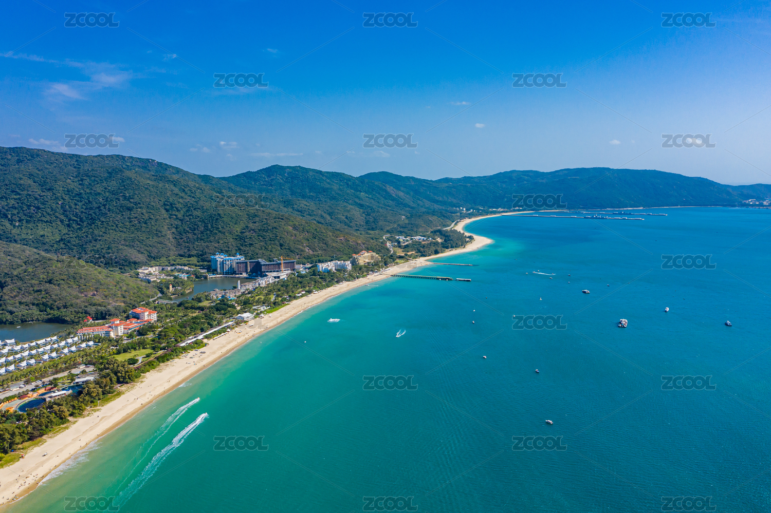 航拍国家海岸海南三亚亚龙湾海岸线与游艇风