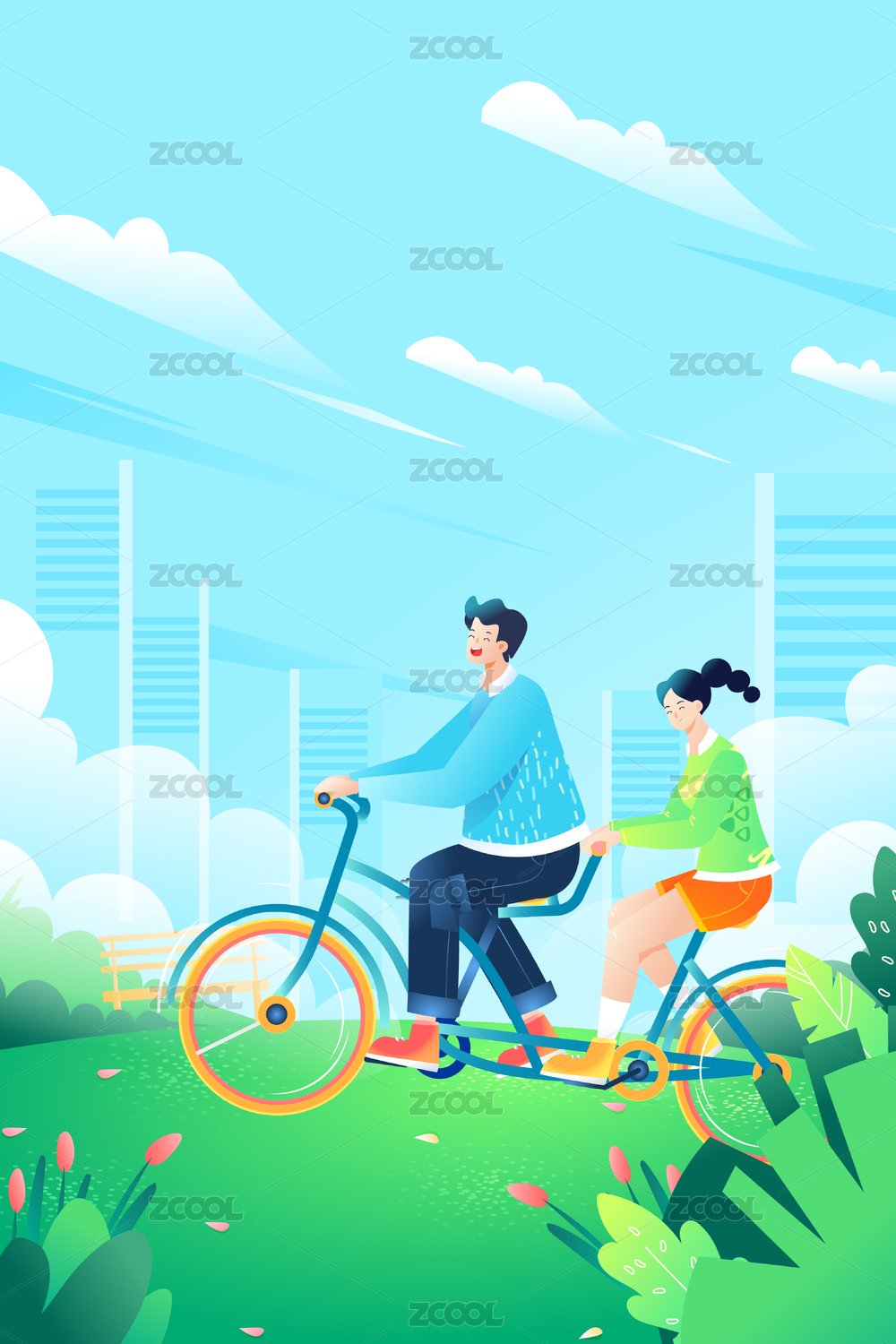 卡通立春出行踏青情侣骑自行车背景矢量插画