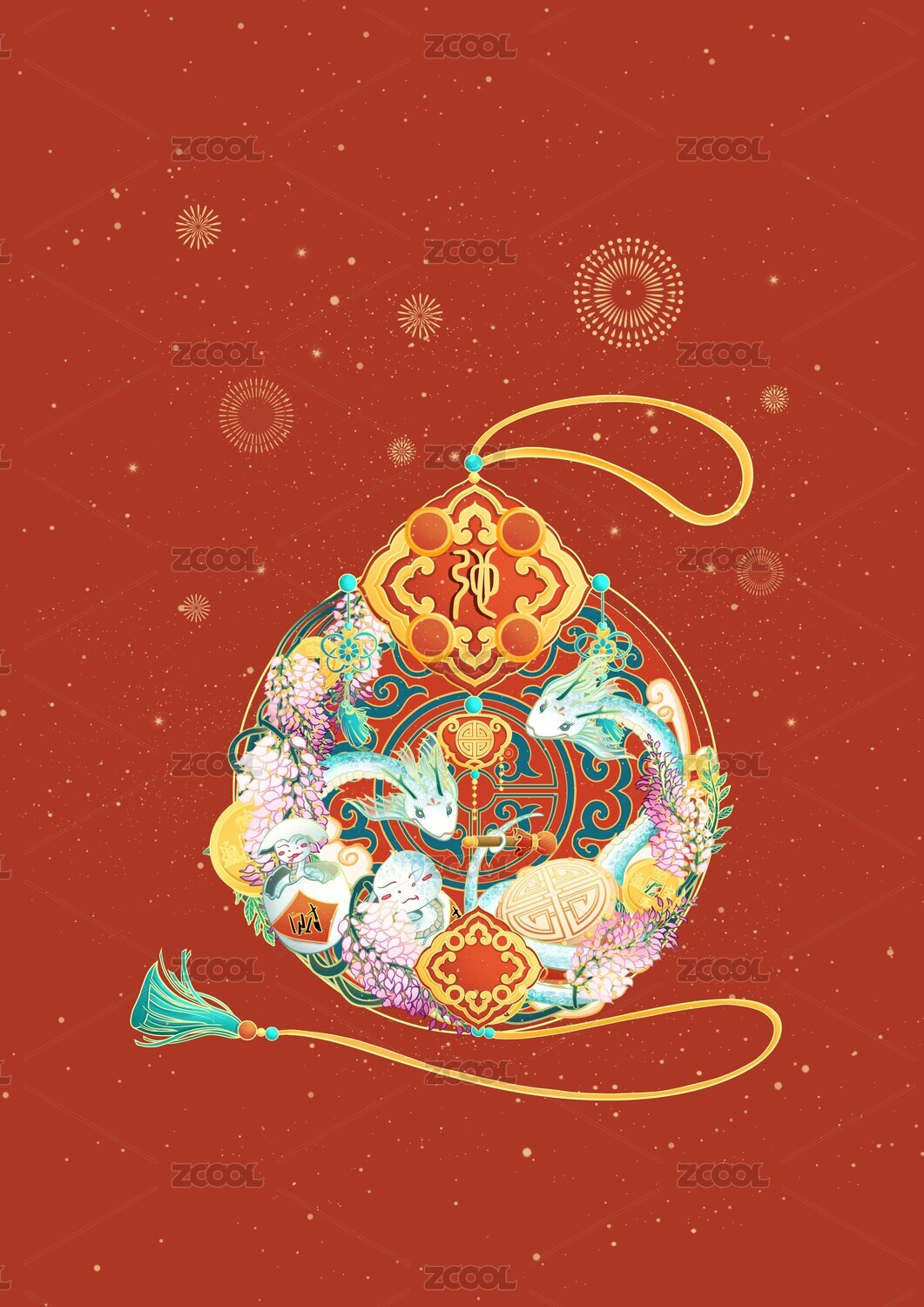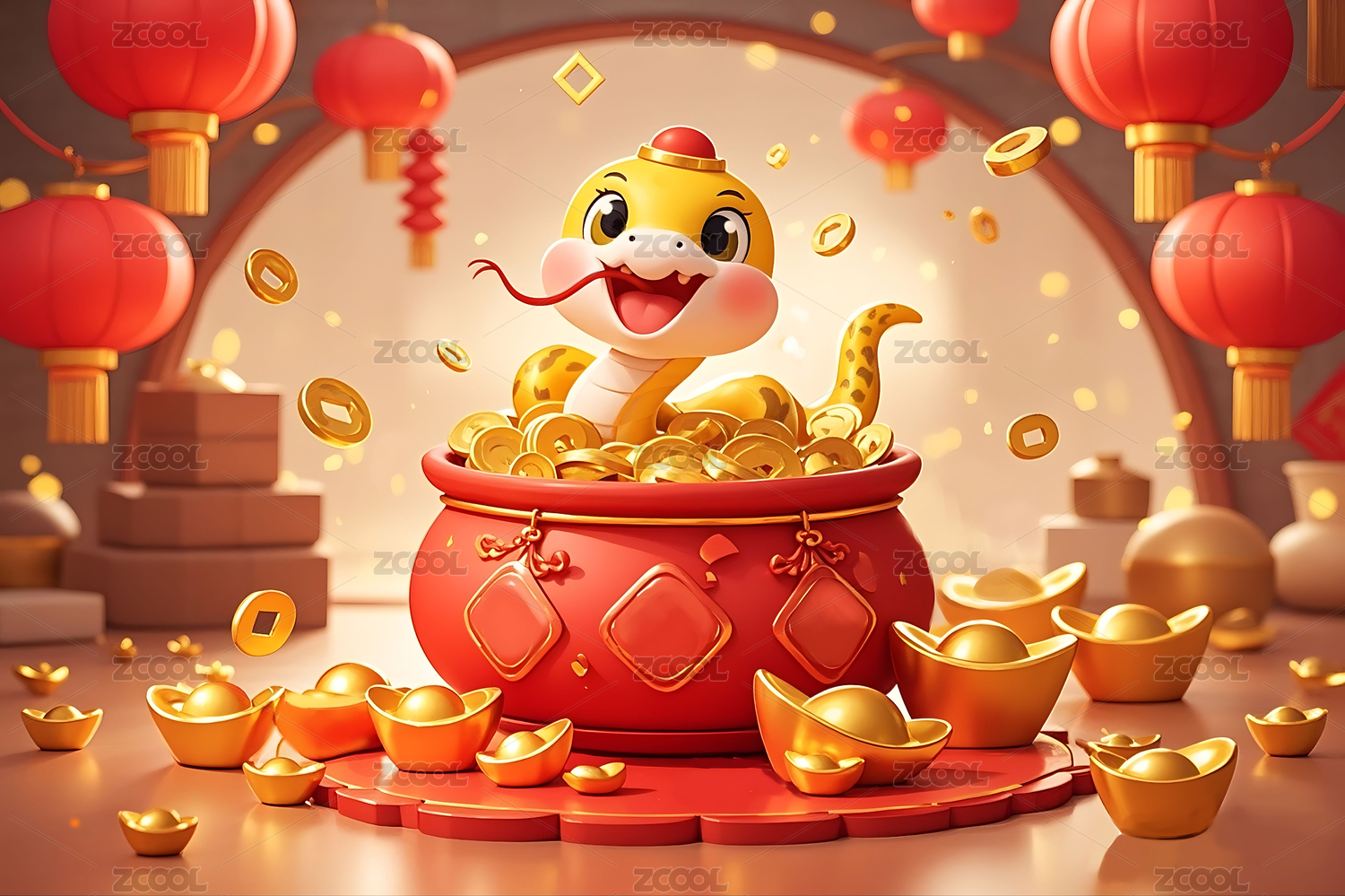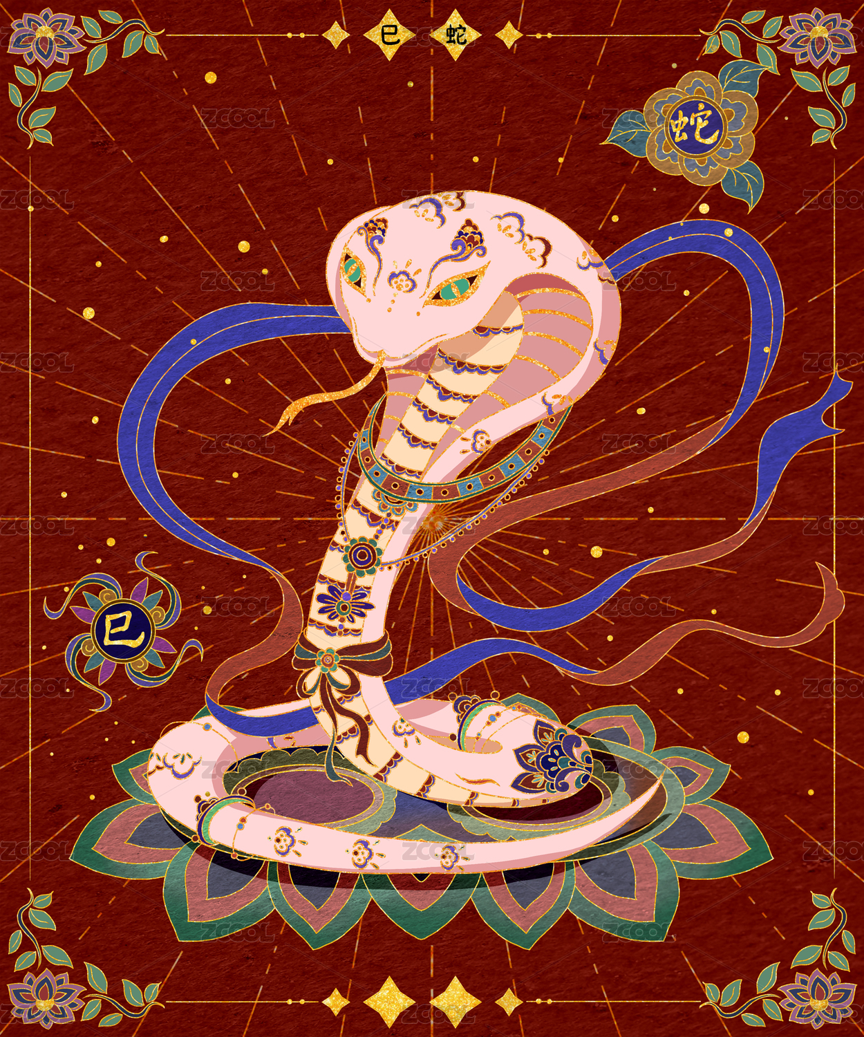 国潮十二生肖巳蛇时尚印花装饰纹样卡通形象