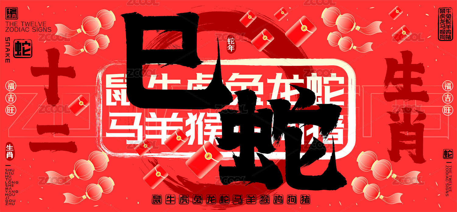 巳蛇十二生肖红包灯笼水墨中国风矢量书法字