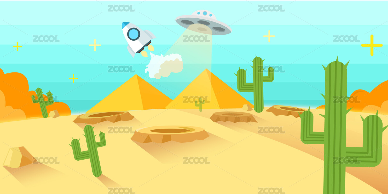 沙漠 UFO 火箭 仙人掌 场景卡通 矢量图