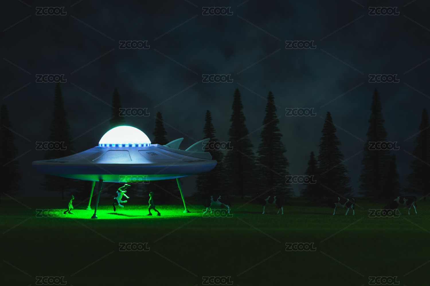 微缩摄影外星人外星飞船UFO吸收奶牛森林神秘实验科幻插图