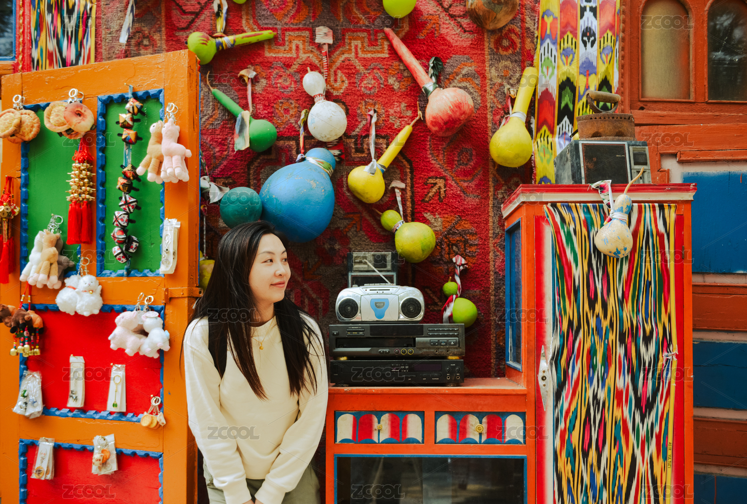 中国女性在中国新疆库车的民族风情街道游玩
