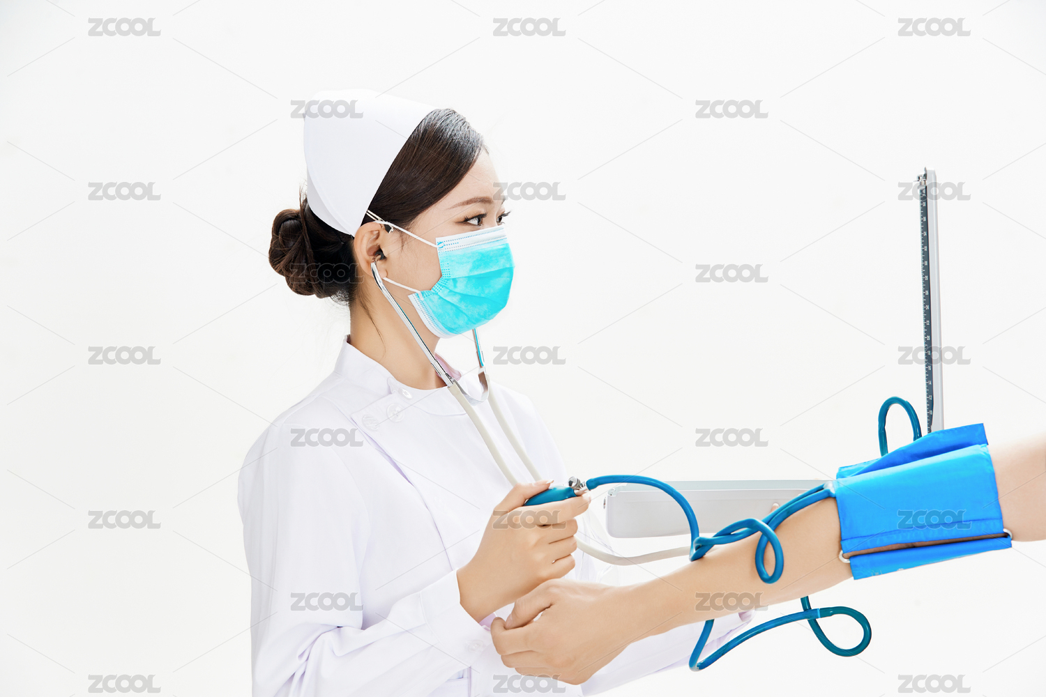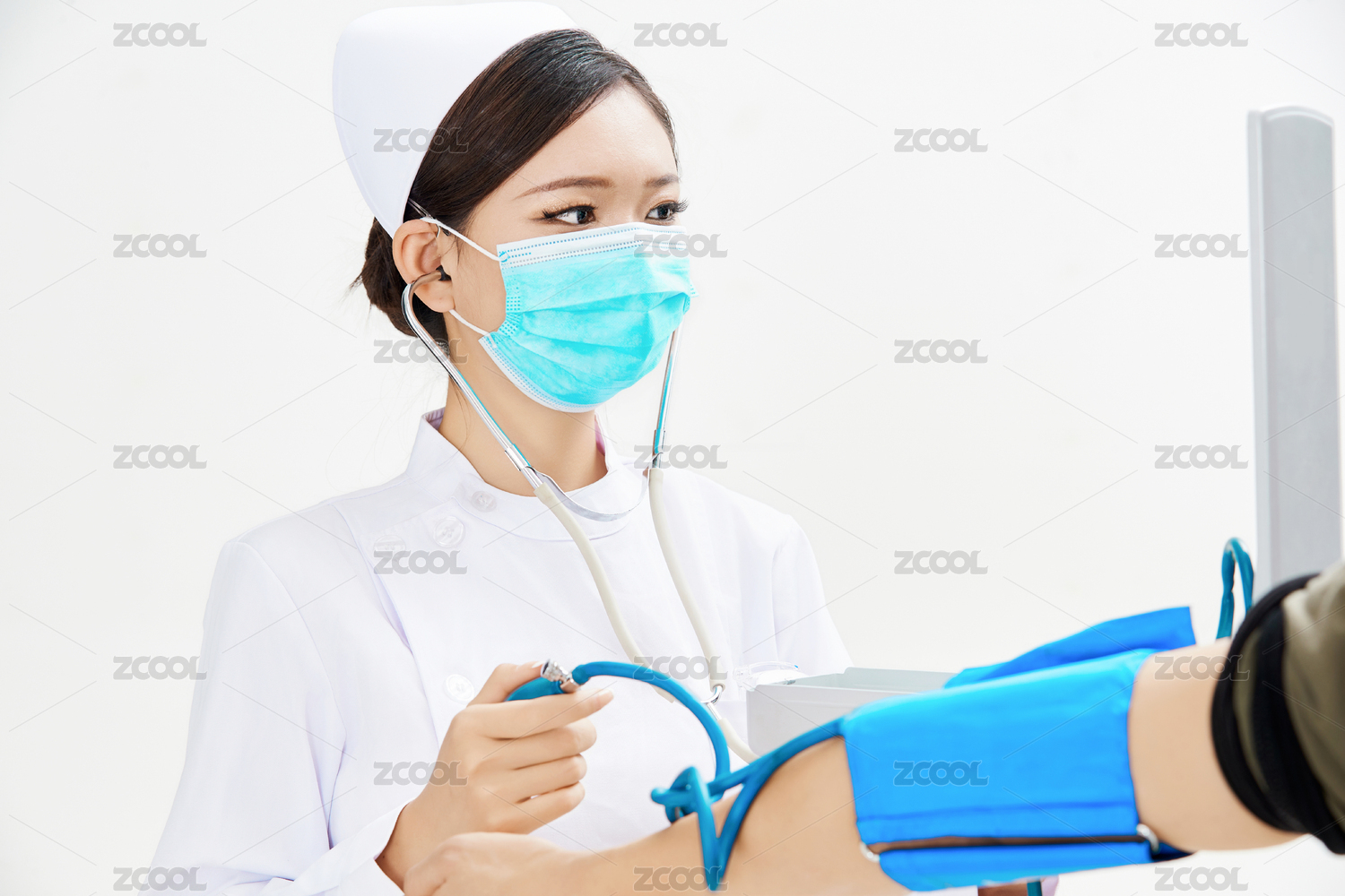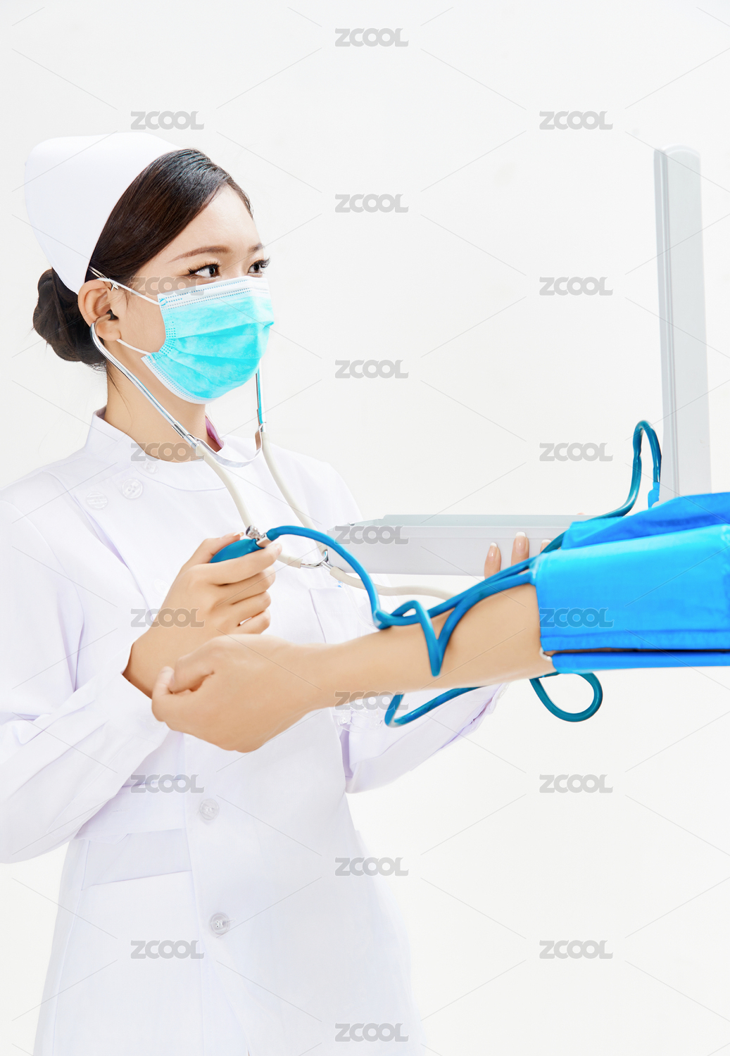 白色背景下手持血压计为患者测量血压的护士