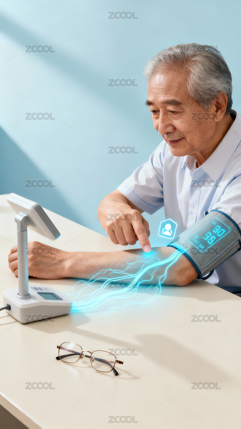 老人用自动血压计测量血压医疗插画白色背景