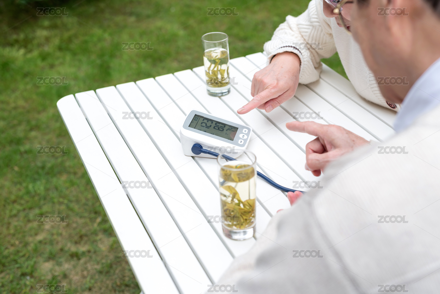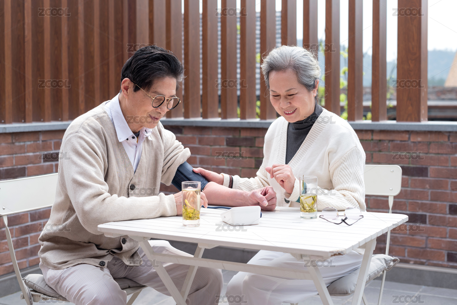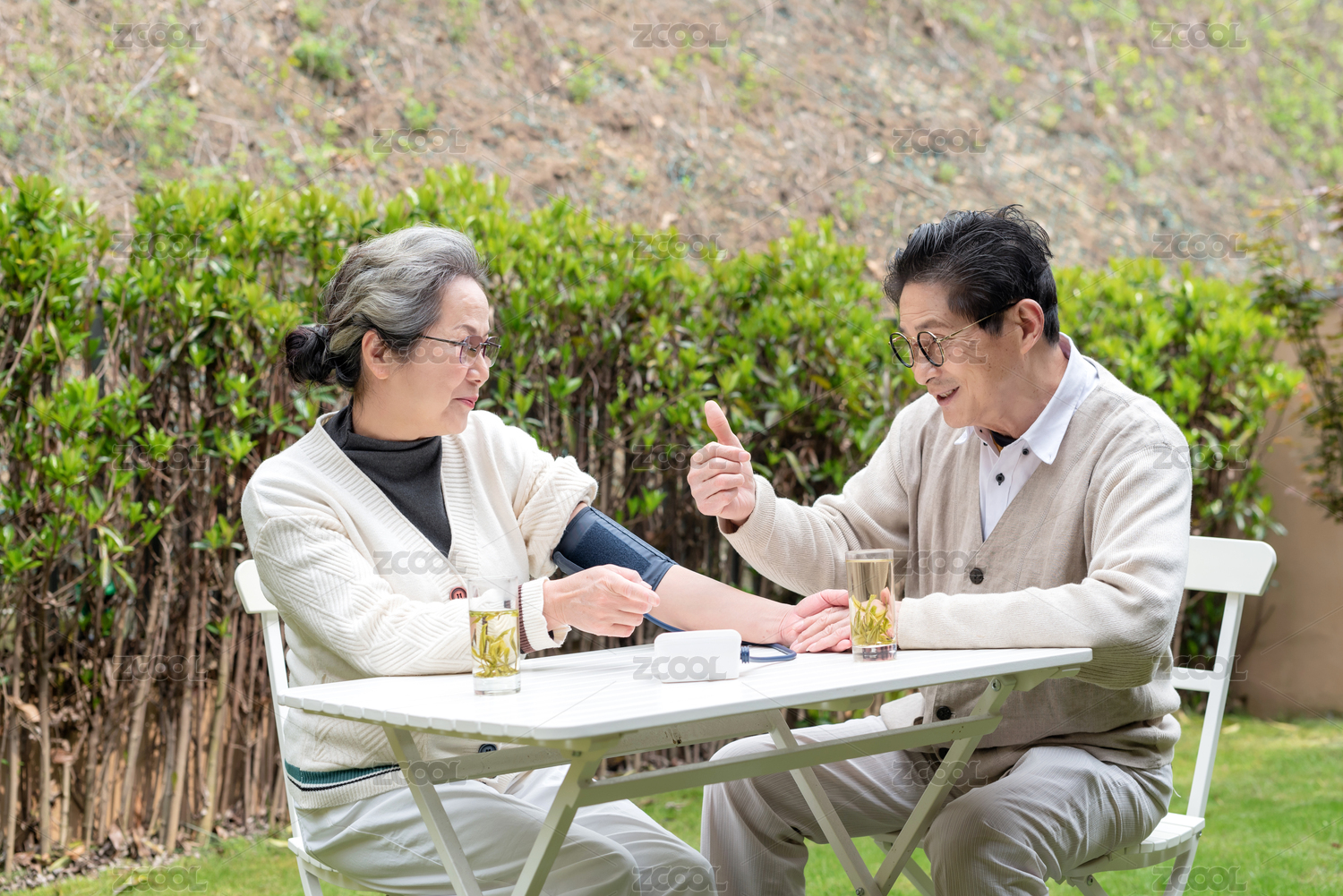 一对正在使用血压仪的亚洲老年夫妇