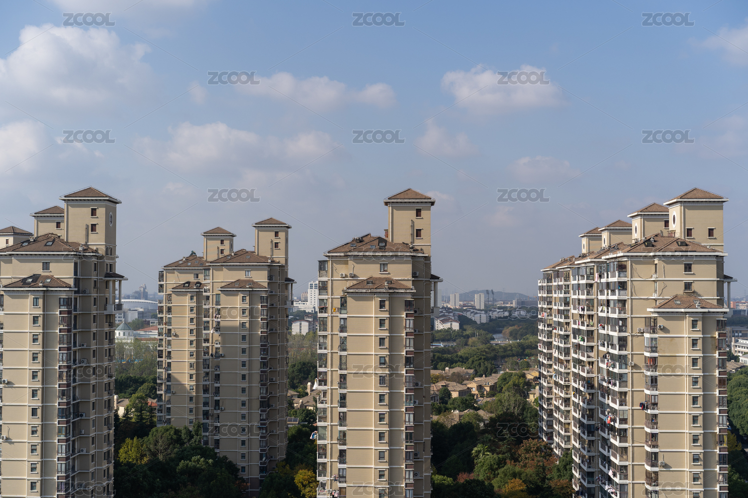 蓝天白云下的上海松江某小区高层住宅