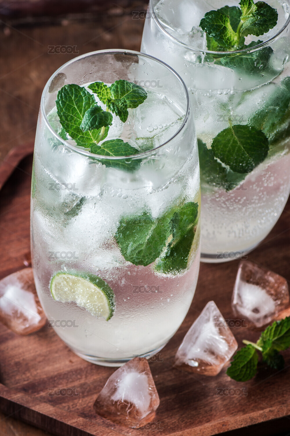 木桌上的两杯冰镇青柠莫吉托