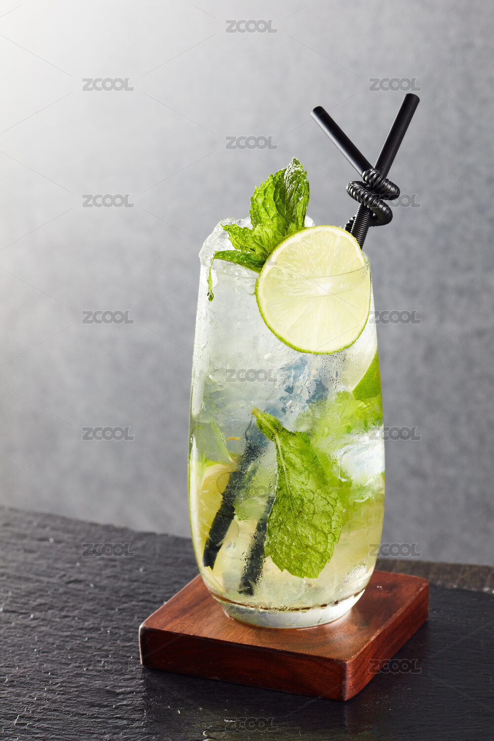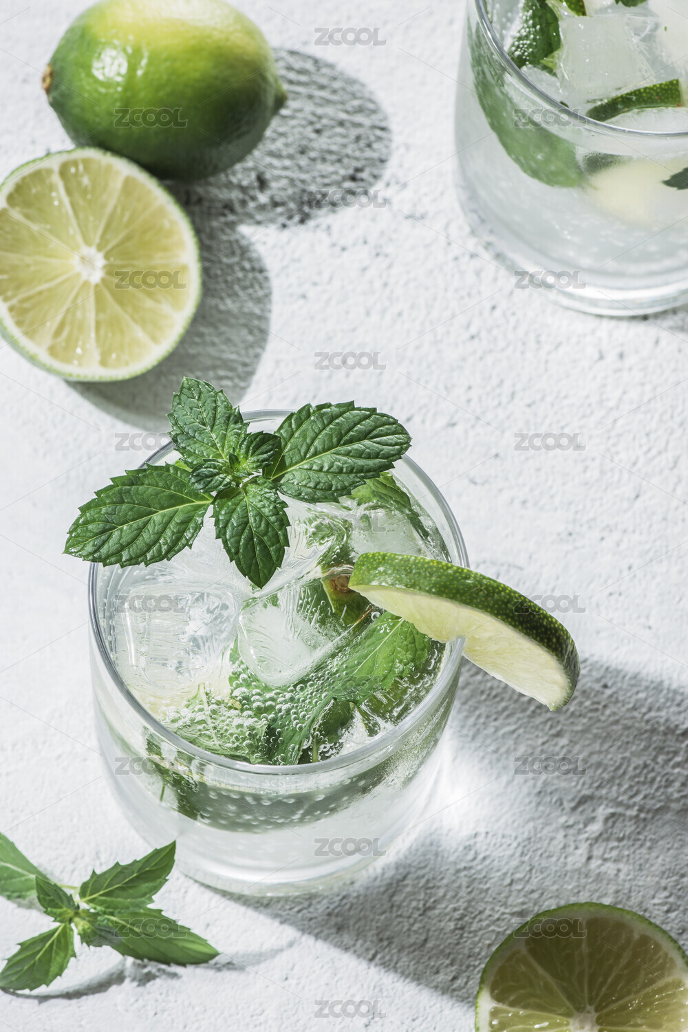 放置在水泥质感桌面上硬光拍摄的莫吉托