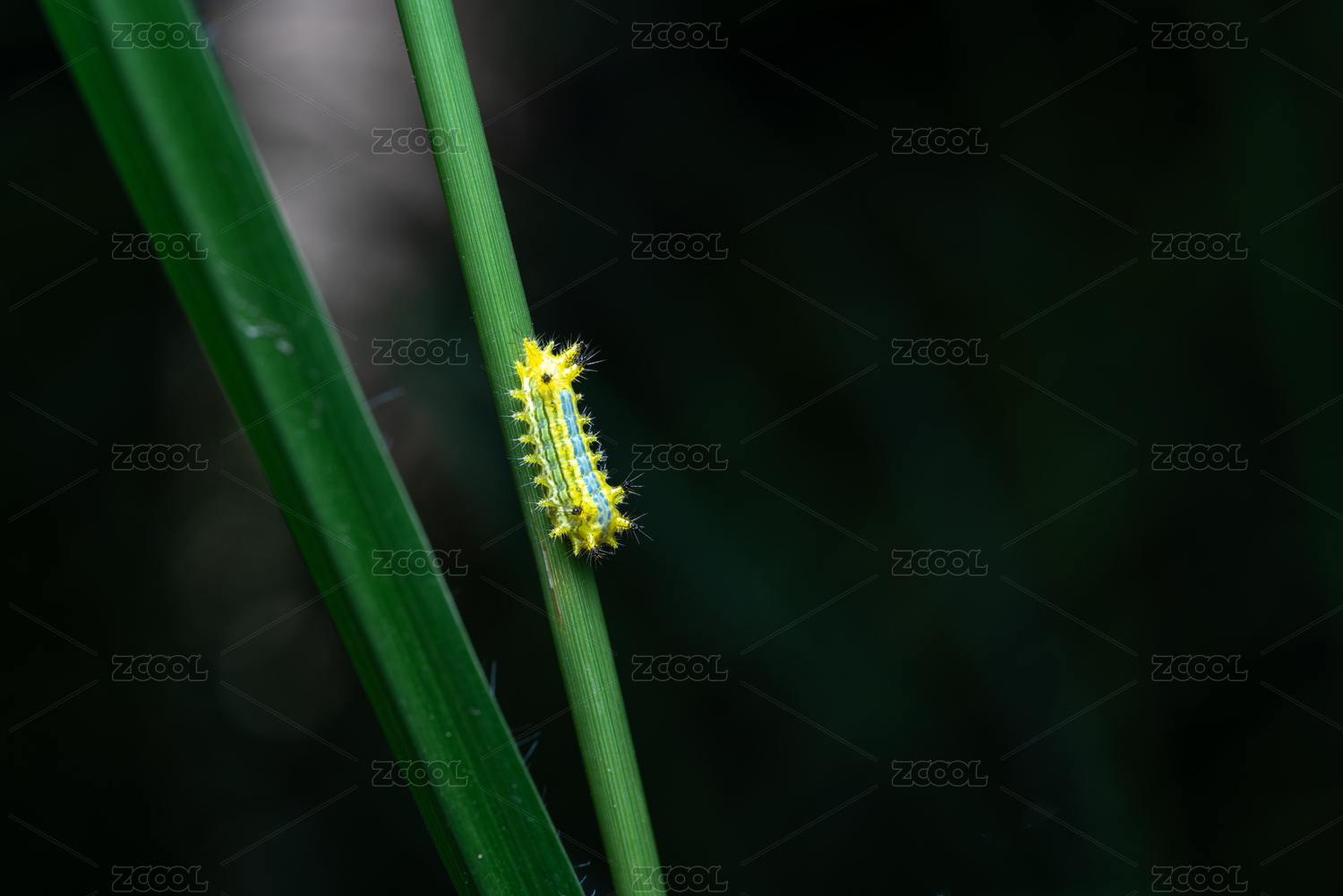 绿叶上的黄蓝毛毛虫