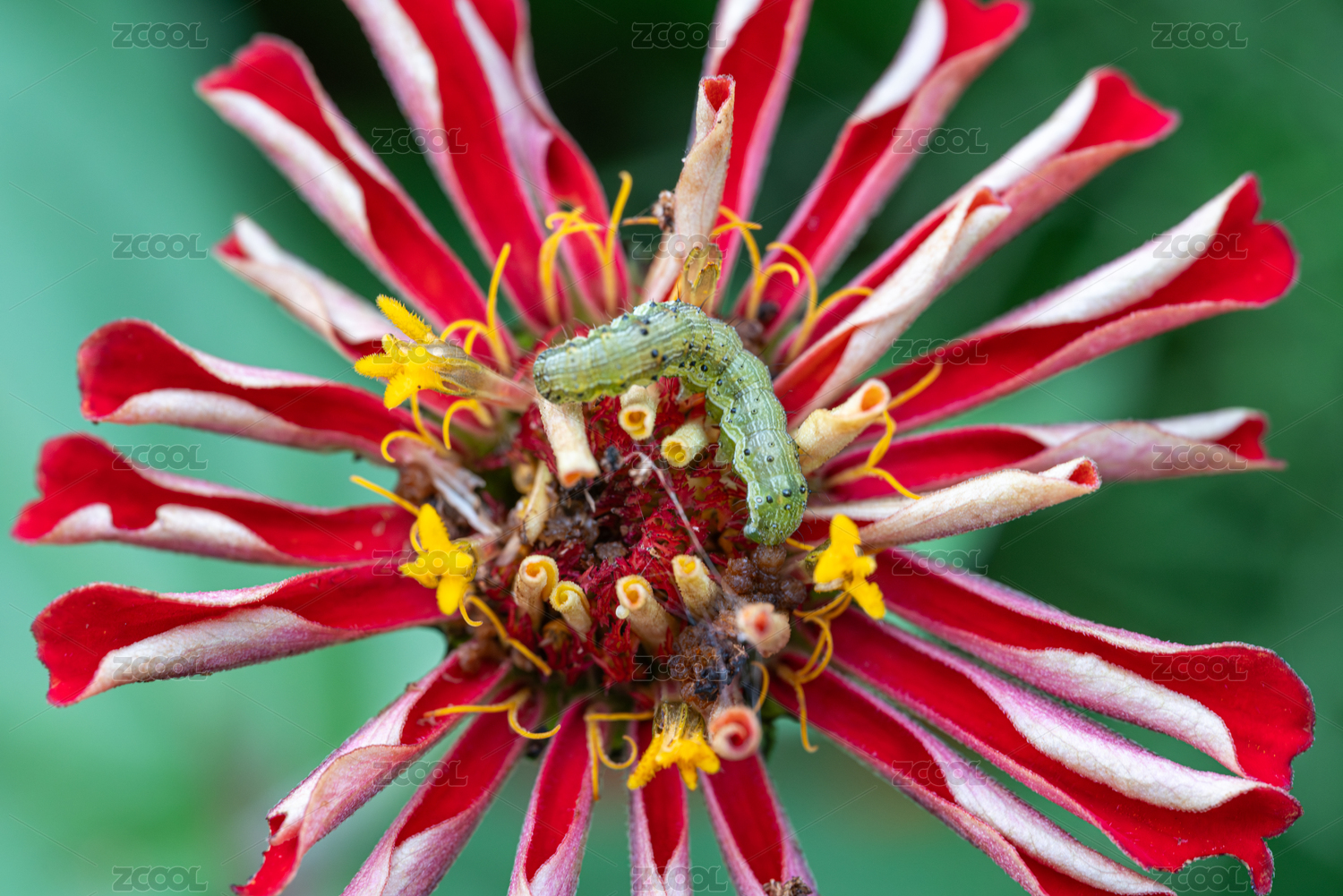 赤色花瓣上的绿色毛毛虫
