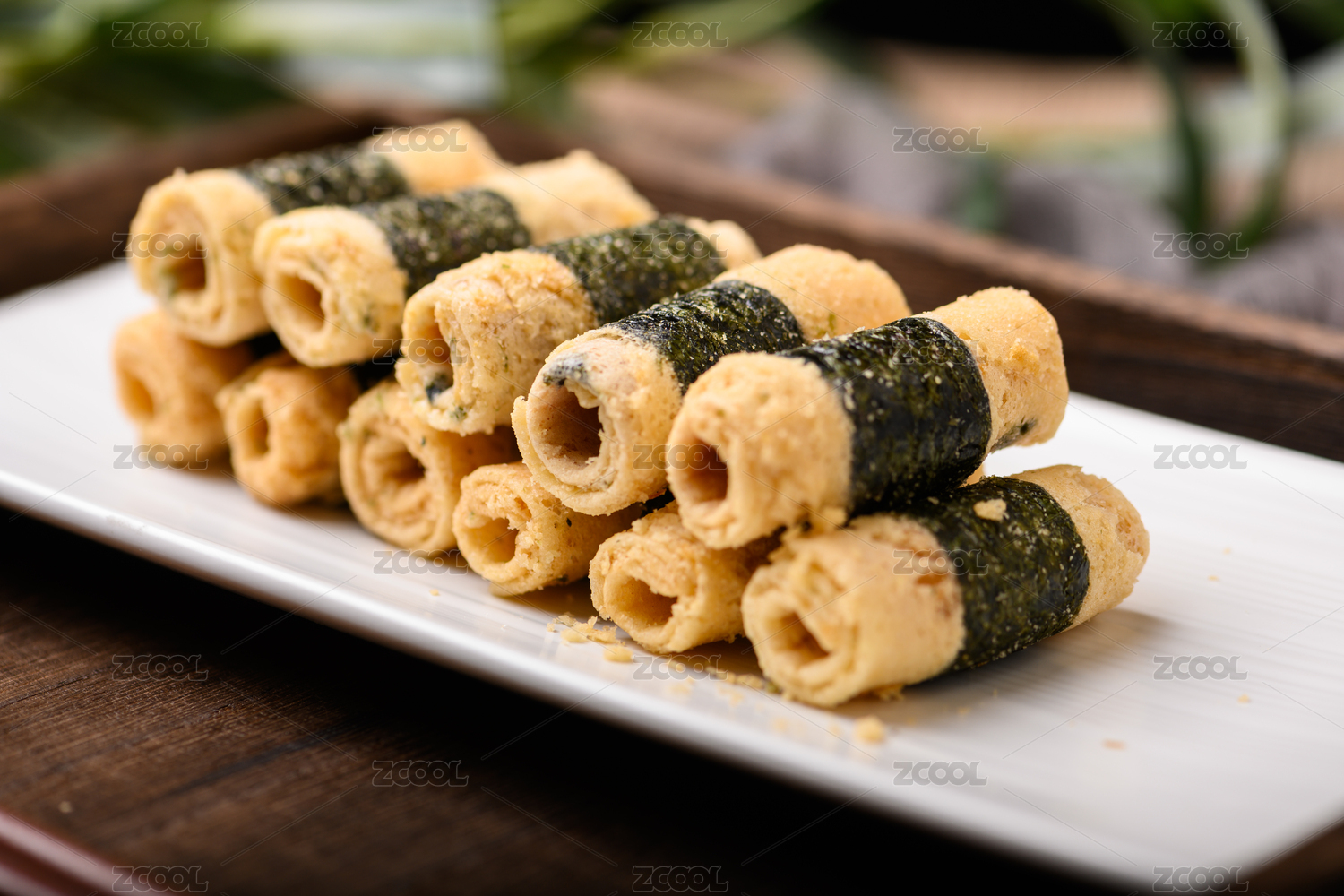 桌上的一盘鸡蛋卷零食