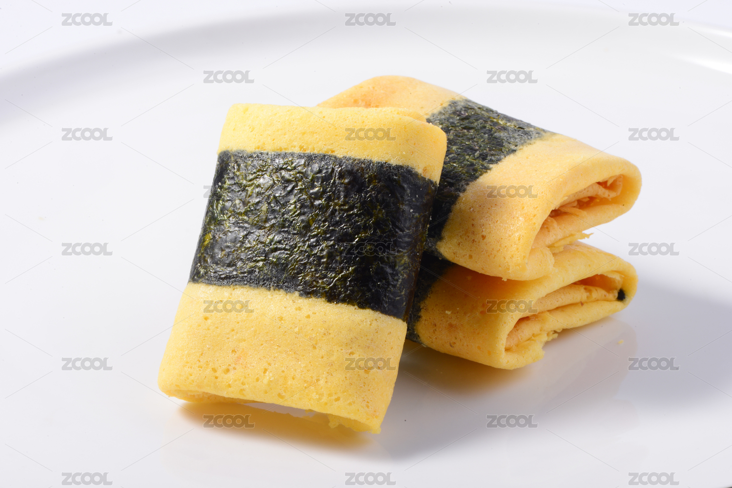桌面上的白色陶瓷盘子里的紫菜蛋卷