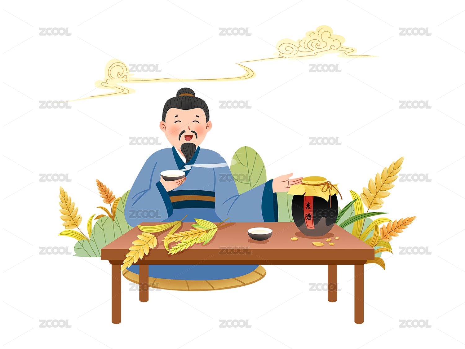 秋分习俗一人喝米酒稻谷酒香祥云元素