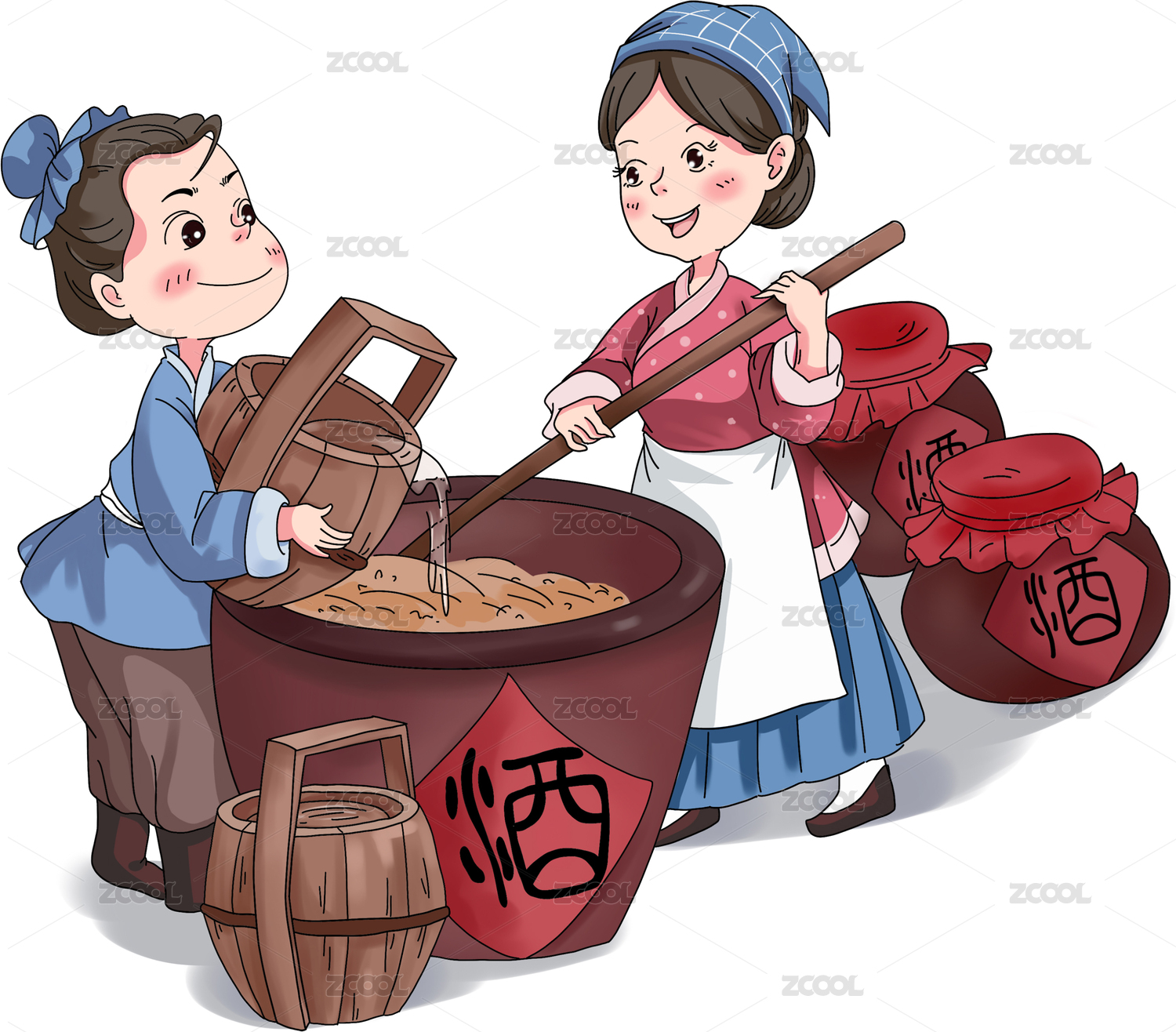 蓝红色卡通秋分习俗夫妻一起酿米酒