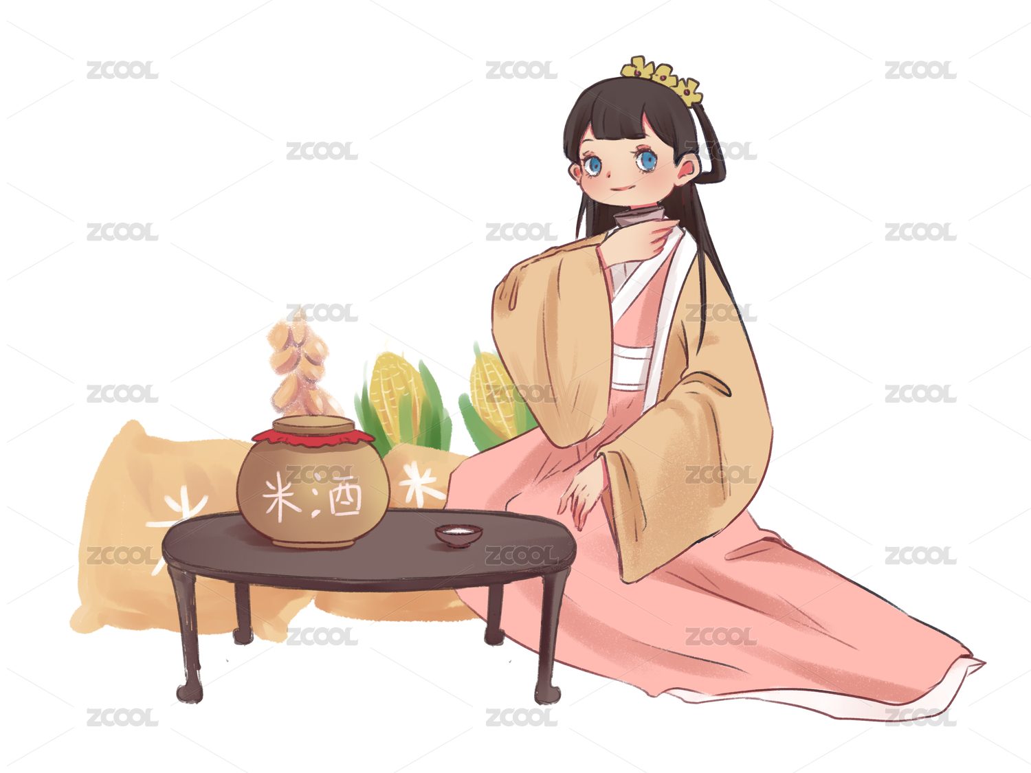 浅粉色秋分习俗喝米酒汉服丰收元素