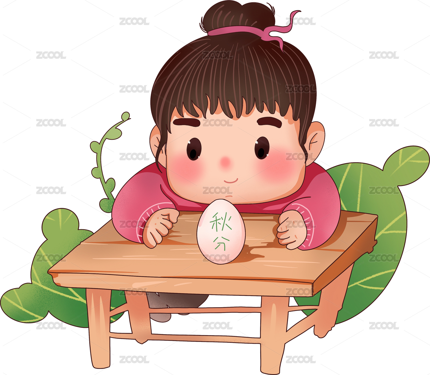 粉绿色卡通风秋分习俗小女孩在桌上竖蛋
